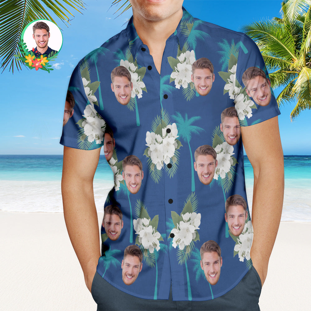 50% SCONTOCamicia Hawaiana Da Uomo Con Motivo Ibisco Blu Con Faccia Personalizzata, Camicia Da Spiaggia Aloha, Regalo Per Lui -