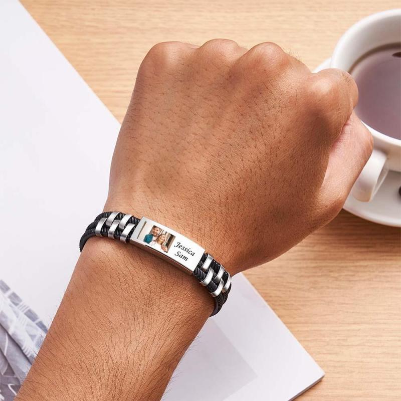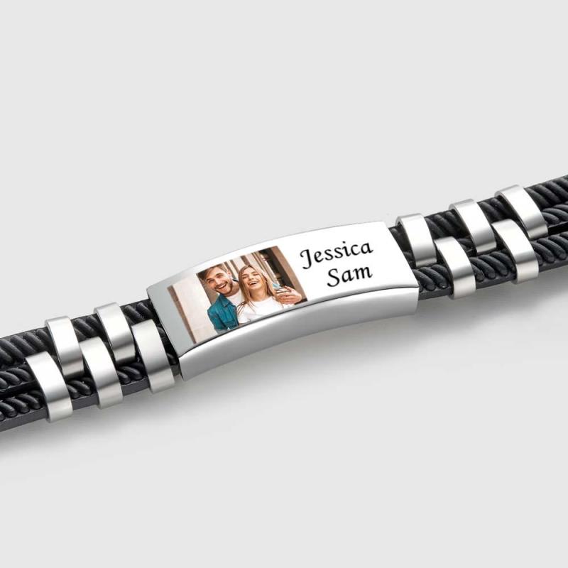 Presentiamo il nostro squisito braccialetto da uomo in pelle e acciaio inciso su misura, un regalo indimenticabile per lui! Questo pezzo unico presenta una foto e nomi personalizzati, che lo rendono davvero unico nel suo genere. Realizzato con precisione, il nostro braccialetto offre la possibilità di stampare immagini sia a colori che in bianco e nero, aggiungendo un tocco di significato. Che si tratti di un anniversario o di un'occasione speciale, questo braccialetto è un gesto sincero che sarà apprezzato. Esplora la nostra collezione e sorprendi la persona amata con questo ricordo senza tempo e sentimentale.