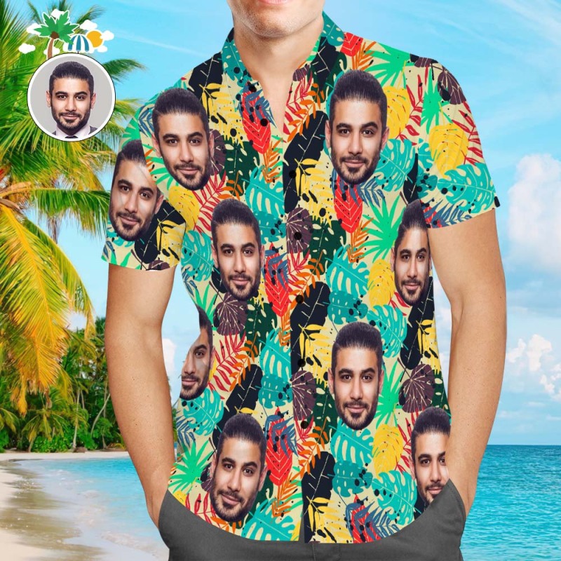 Camicia Hawaiana Aloha Con Stampa All-over Da Uomo Con Faccia Personalizzata, Foglie Colorate