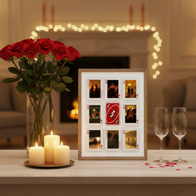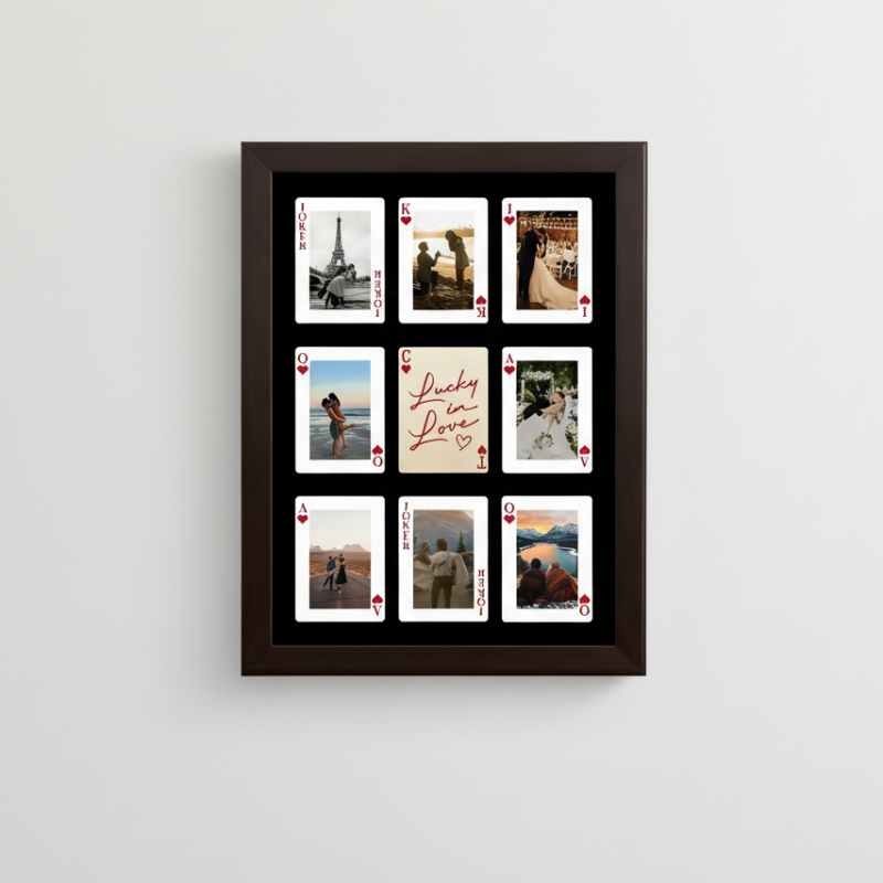 Trasforma la tua storia d'amore in un'opera d'arte. Questa cornice personalizzata con foto a forma di carte da gioco trasforma i tuoi ricordi preferiti in un romantico design ispirato alle carte da gioco, unendo l'arte murale moderna a una personalizzazione significativa. Ispirato all'estetica del poster virale 'Quanto siamo fortunati', è più di un regalo: è un promemoria visivo di connessione, fortuna e momenti condivisi.