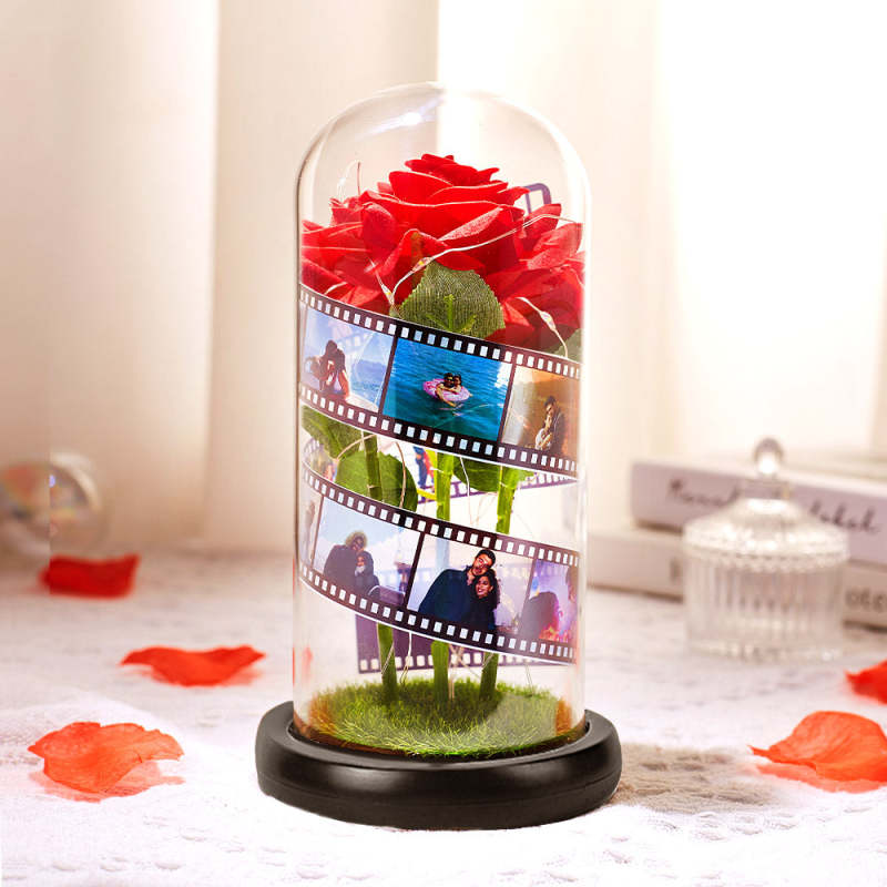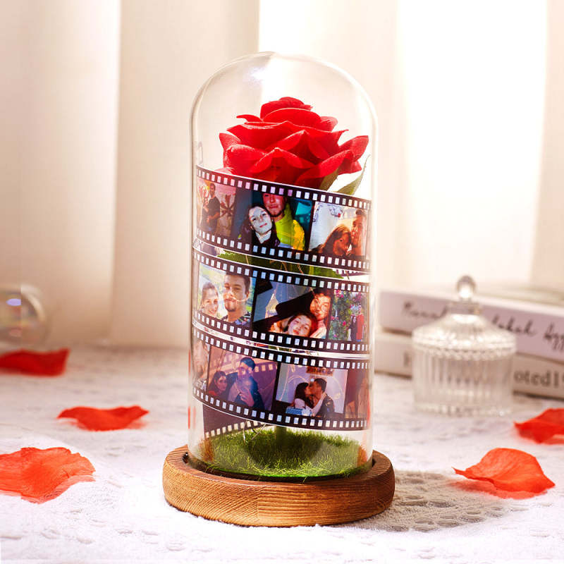 Album Fotografico Personalizzato Con Fiore Rosa In Vetro Con Lampada A Led Con Base In Pellicola Nera - Regalo Per Lei Lampada Personalizzata
