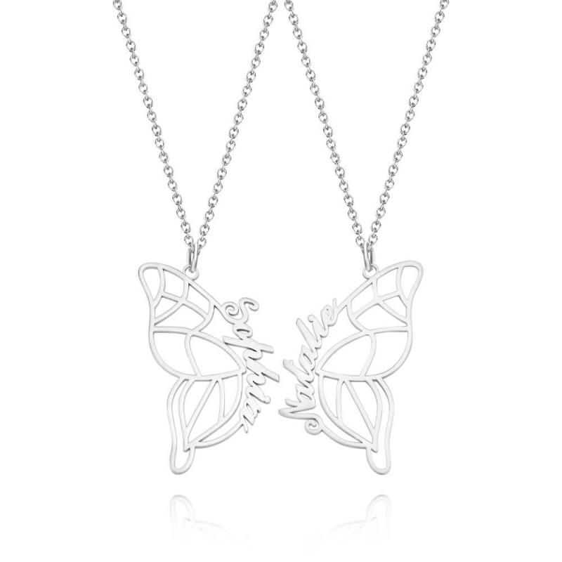 Aggiungi un tocco di eleganza al tuo legame con il nostro set personalizzato per migliori amiche con due collane a farfalla. Questa splendida collana BFF personalizzata per 2 presenta ali di farfalla finemente realizzate, che simboleggiano la bellezza dell'amicizia. Disponibile in argento, oro o oro rosa, questo regalo di amicizia ricorda perfettamente il tuo legame speciale.