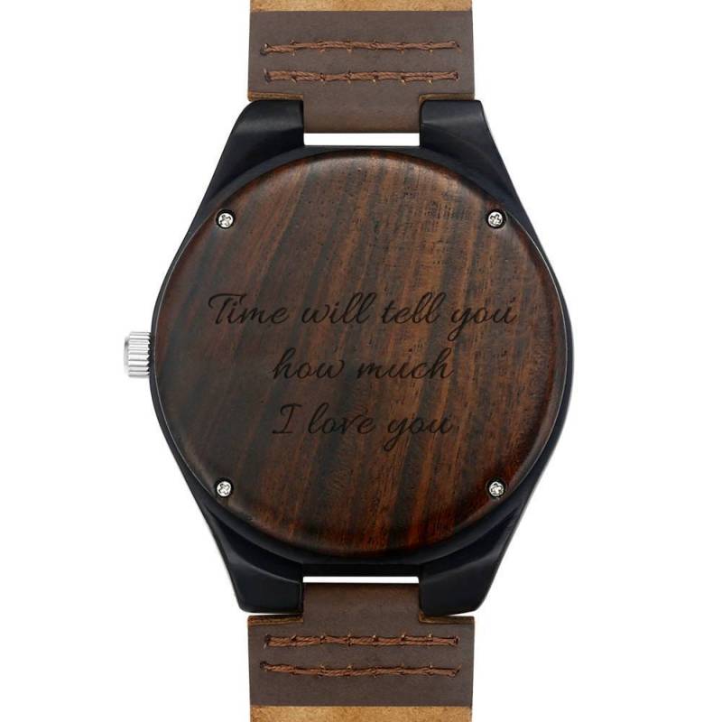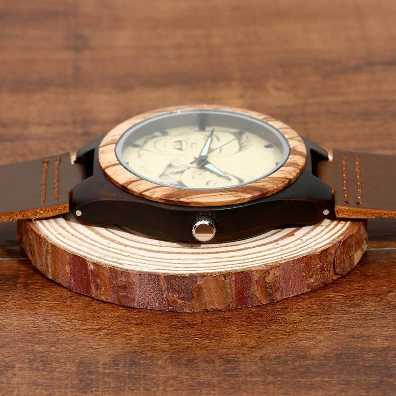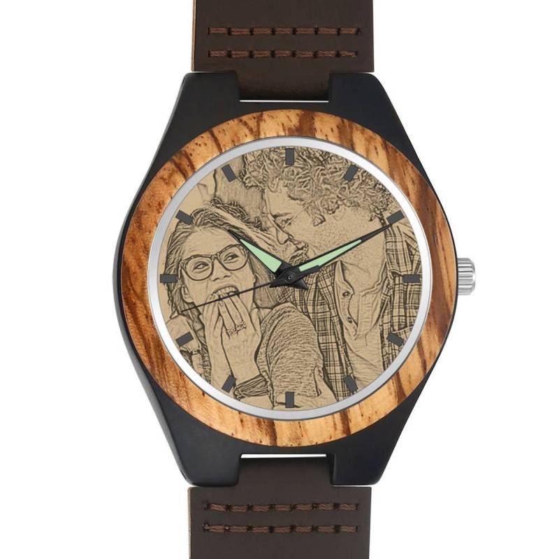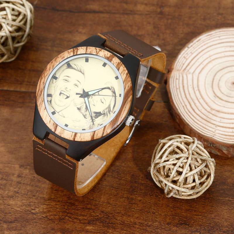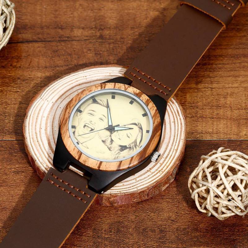Orologio Da Foto In Legno Inciso Da Uomo Cinturino In Pelle Marrone 45mm