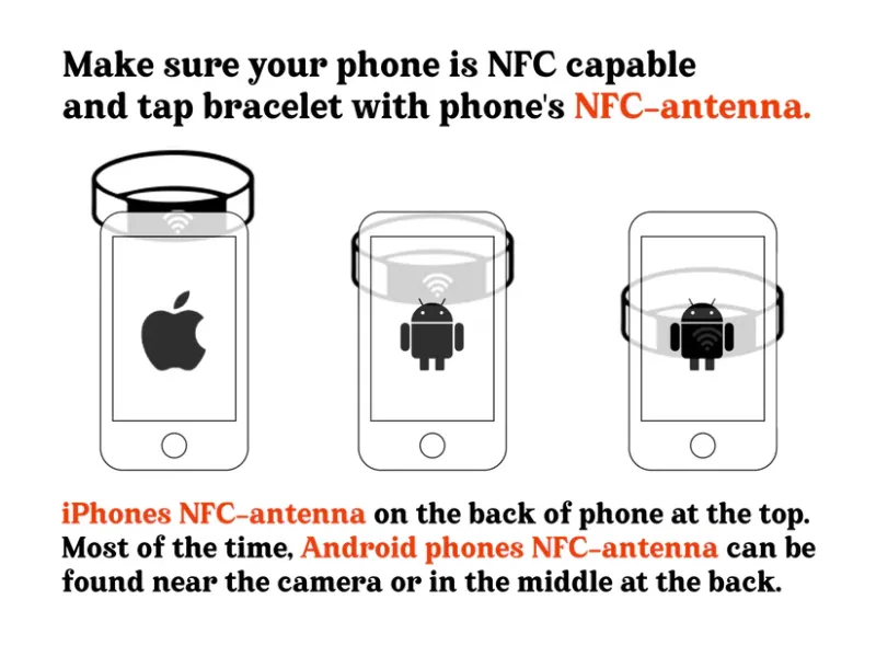 Assicurati che il tuo smartphone sia compatibile con NFC e tagga il braccialetto con l'antenna NFC dello smartphone. L'antenna NFC dell'iPhone si trova nella parte superiore del retro del telefono. Nella maggior parte dei casi, l'antenna NFC dei telefoni Android si trova vicino alla fotocamera o al centro sul retro.