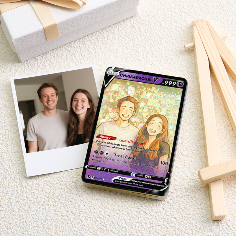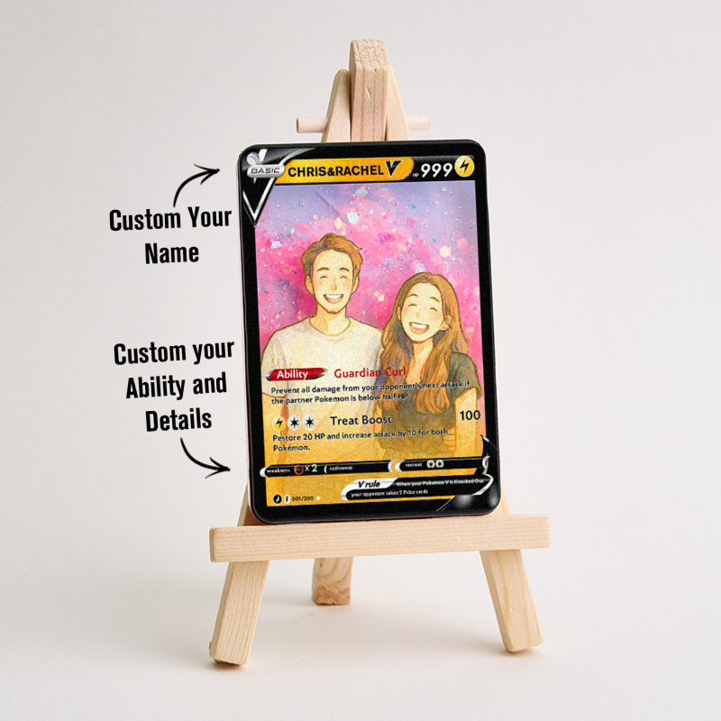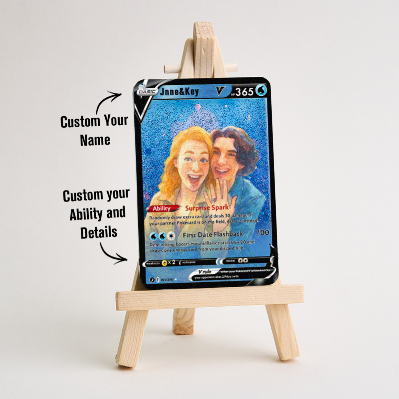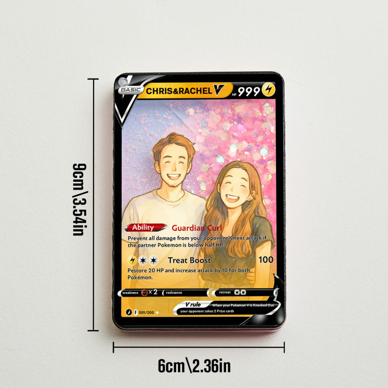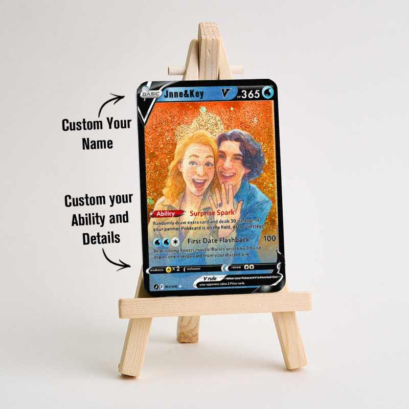 Celebra il tuo amore con la nostra Pokecard Anime 3D Floating Sand V personalizzata per coppie! Questo ricordo unico nel suo genere unisce il fascino degli anime, l'arte della sabbia galleggiante 3D e lo stile delle Pokecard, perfetto per le coppie che condividono la passione per la cultura pop.