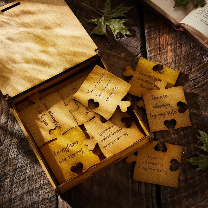 Questo puzzle in legno è un ottimo regalo per il Ringraziamento, San Valentino e anniversari. La scatola di legno ha un aspetto spettacolare, quindi sarà un regalo molto costoso. C'è un indovinello nella scatola, 12 motivi per cui ti amo. Ogni parte dell'enigma è incisa con la ragione dell'amore. Nel mezzo dell'enigma, ci sarà il nome della persona che ami. Il prodotto è sicuro nella composizione. Questo regalo sarà un bel ricordo per molti anni. È un regalo caldo per la famiglia e gli amanti.
