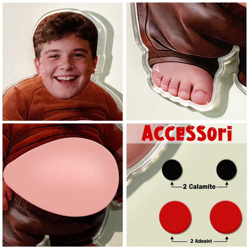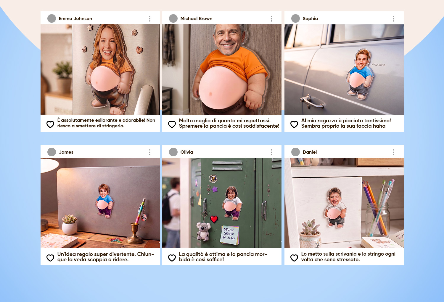 Carica una foto qualsiasi e la trasformeremo in un personaggio divertente e personalizzato.