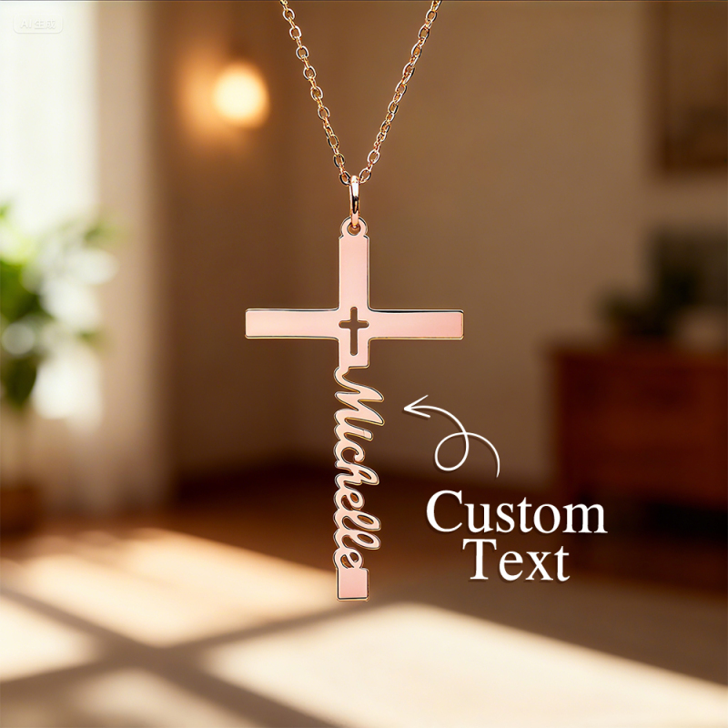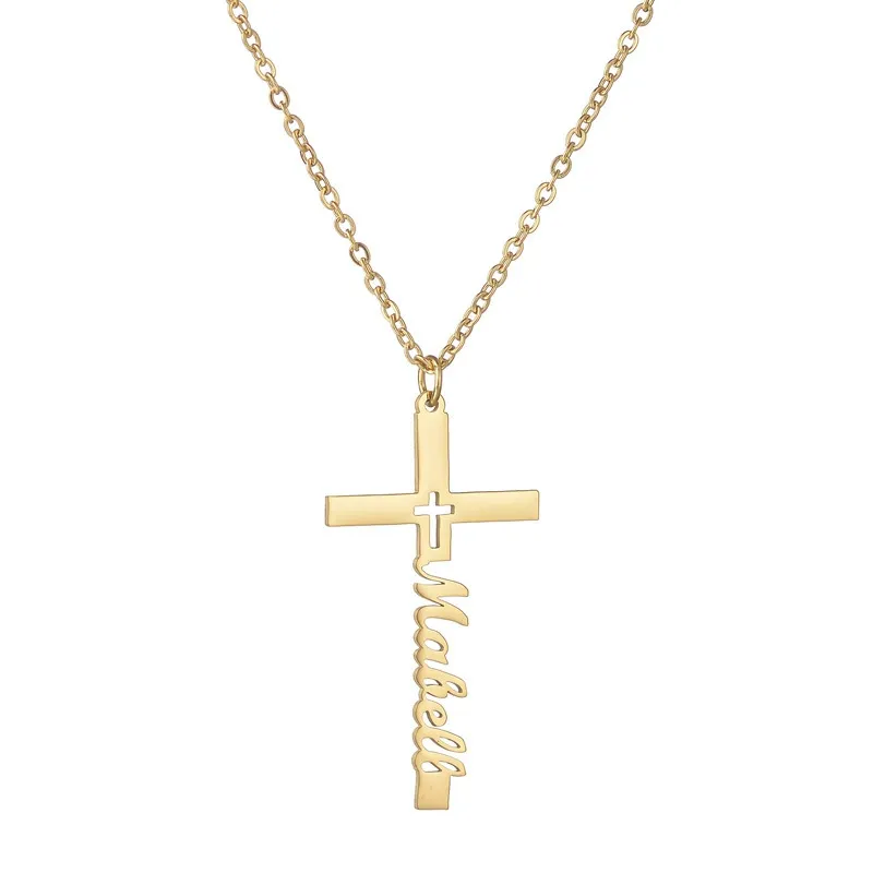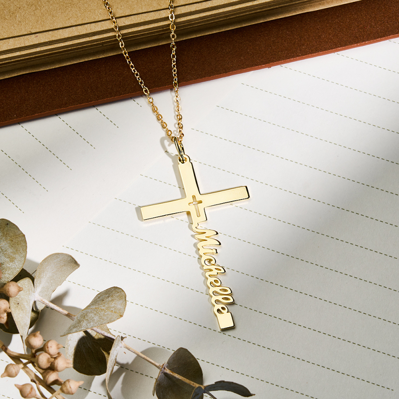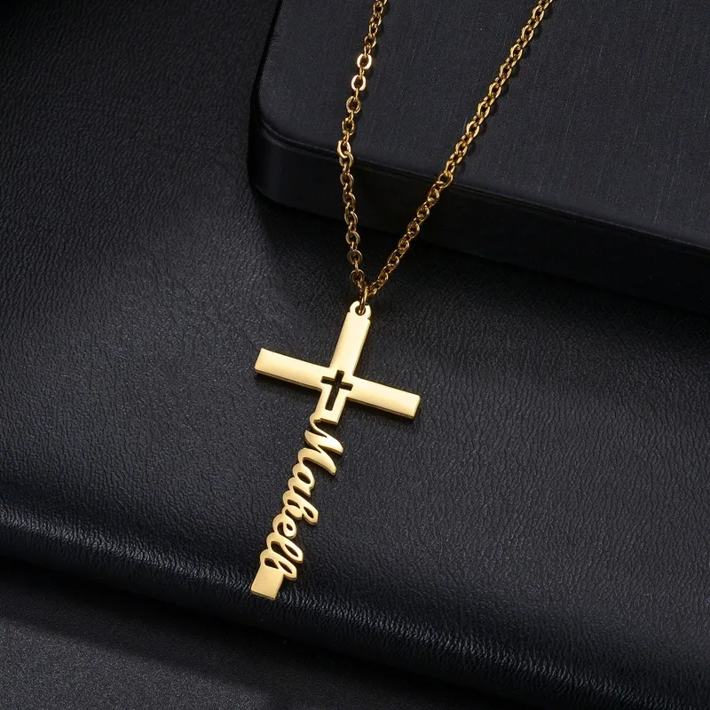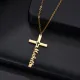 Minimalista ed elegante: un elegante pendente a croce abbinato a una scritta semplice, che lo rende versatile per qualsiasi outfit.