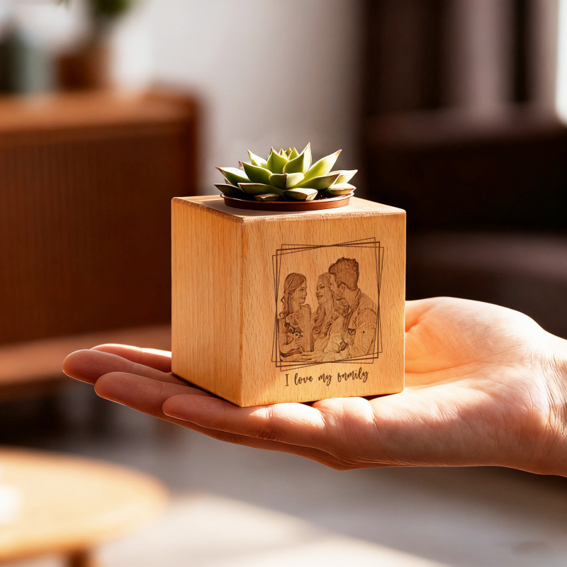 Handcrafted from sustainable, FSC-certified wood, each planter includes a live succulent - a living symbol of the bond you shared. Place it on a windowsill, desk, or shelf to keep their memory blooming.