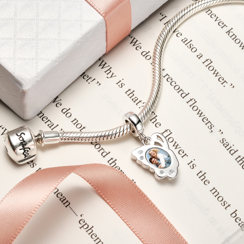 Ciondolo Fotografico Personalizzato Con Ali Di Farfalla E Diamante Blu