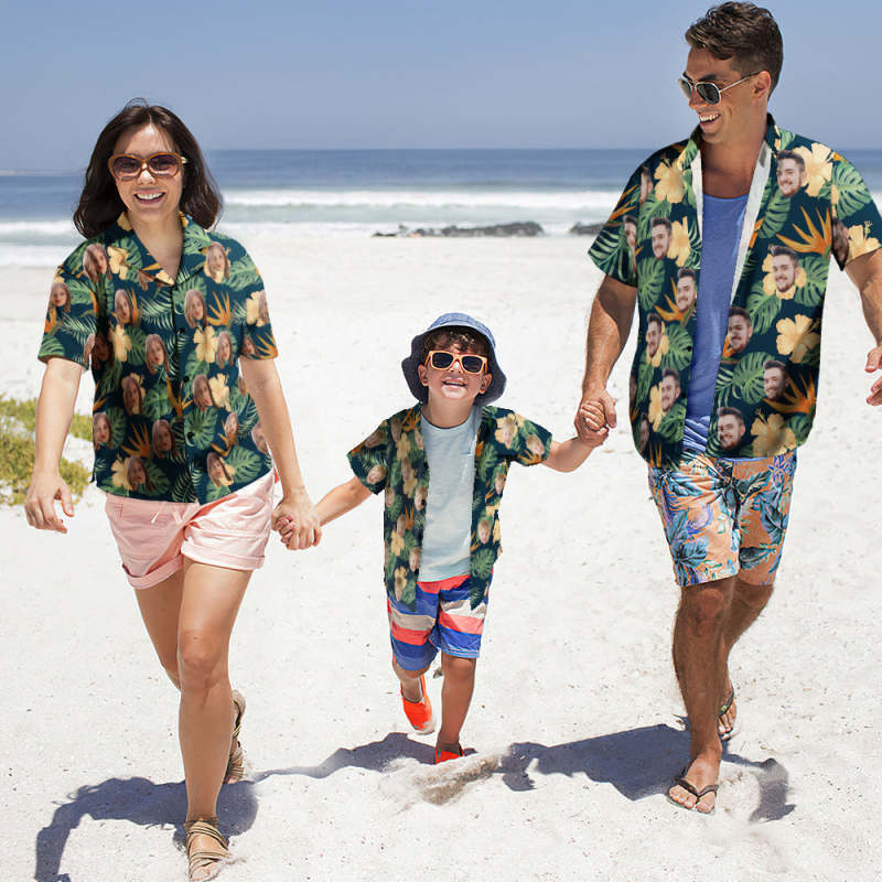 Camicia Hawaiana Con Foto Personalizzata Genitore E Figlio Indossano Una Camicia Hawaiana Con Viso Personalizzato, Regalo Per La Famiglia - Fiori Gialli