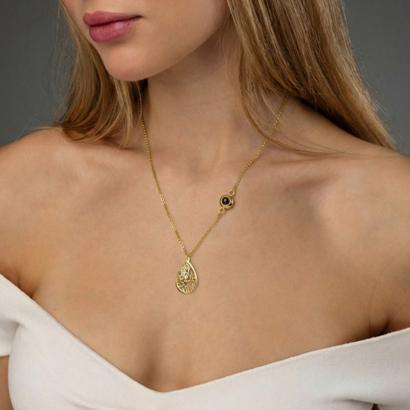 Cattura i ricordi con stile con la nostra collana personalizzata con proiezione fotografica. Questo gioiello dal cuore prezioso presenta un discreto ciondolo a proiezione che, una volta indossato, mostra una foto preziosa, trasformando i momenti quotidiani in un ricordo personale. Il design Cherished Spot Map aggiunge un tocco significativo, contrassegnando un luogo speciale, impreziosito da una pietra preziosa per un tocco di eleganza. Perfetta come regalo di anniversario o come pensiero premuroso per lei, questa collana unisce sentimento e raffinatezza.