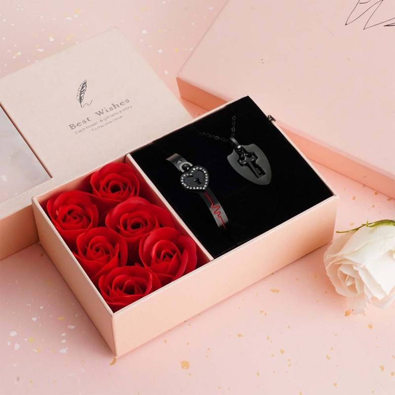 Coppia Di Bracciali E Collane Con Proiezione Personalizzata Con Vera Confezione Regalo Con Orsetto Rosa. Confezione Regalo Con Collana A Forma Di Rosa. Confezione Regalo Con Gioielli