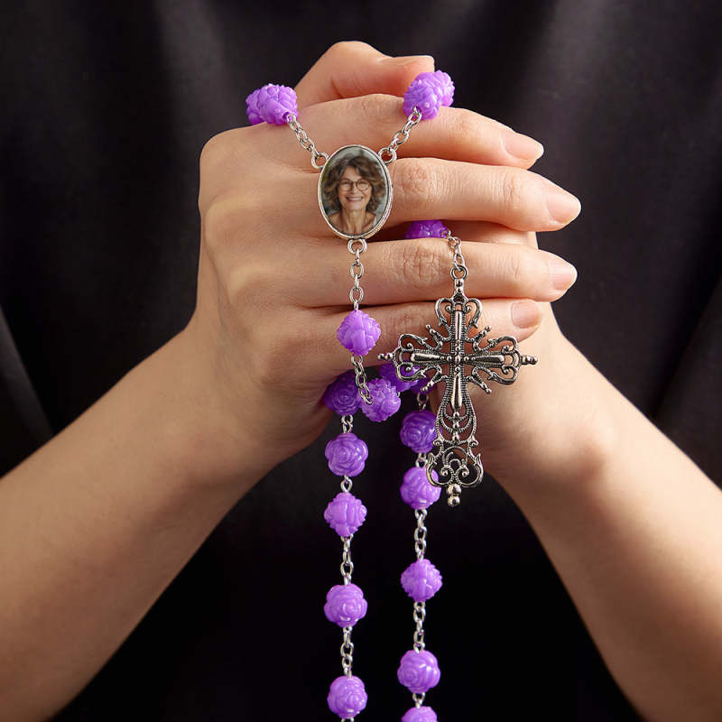 Collana Con Croce Di Perline Di Rosario Personalizzata Collana Con Rosa A Doppia Faccia Viola Personalizzata Con Foto