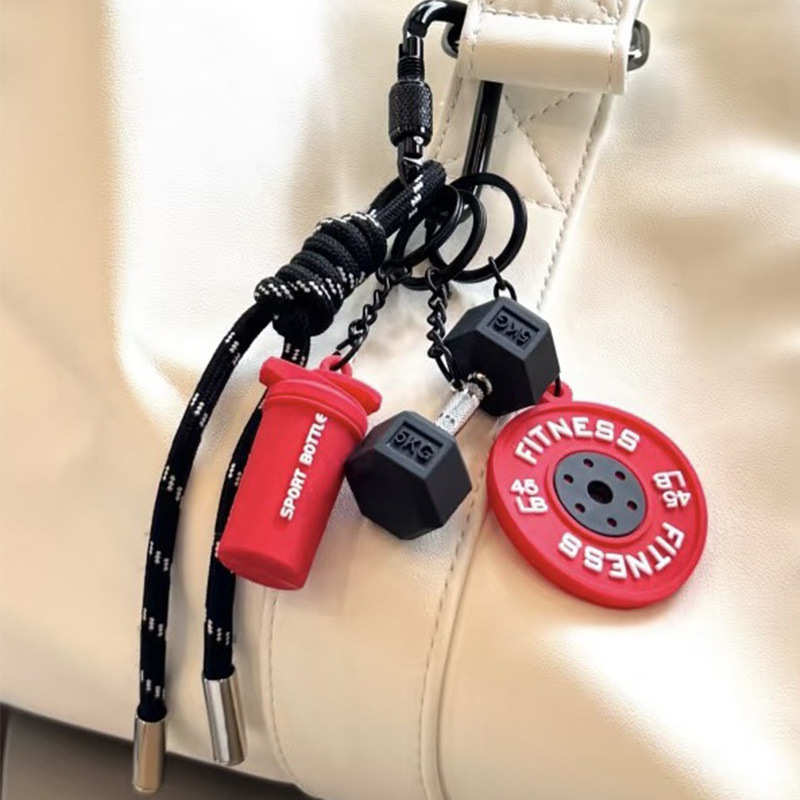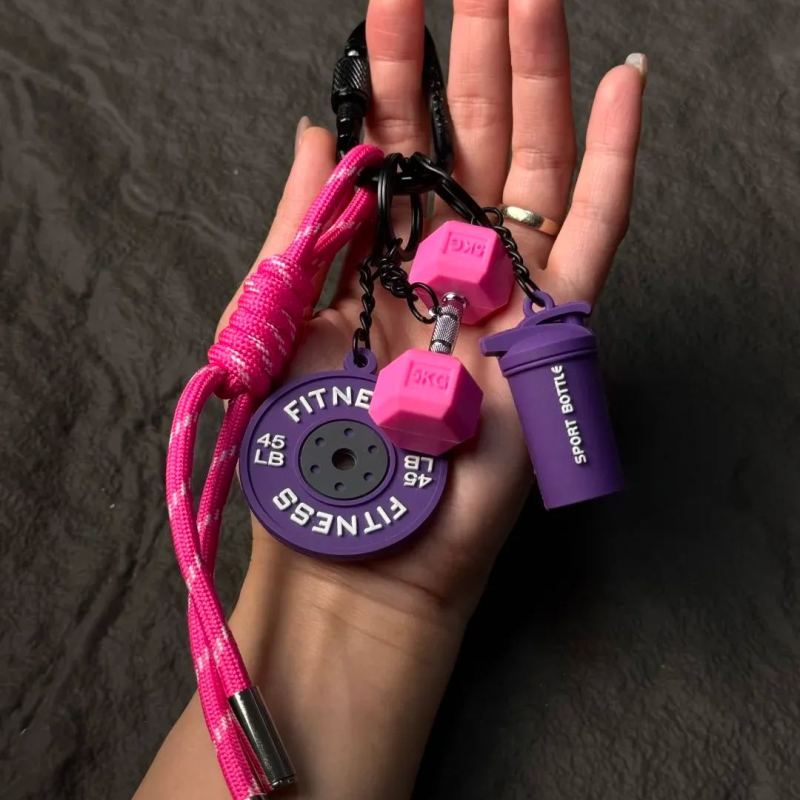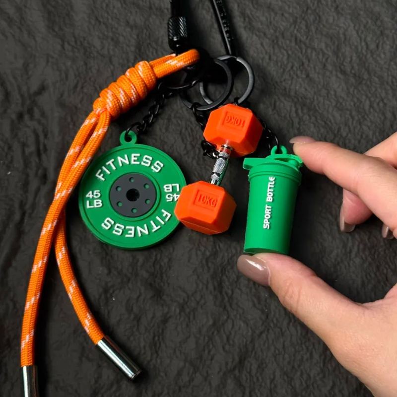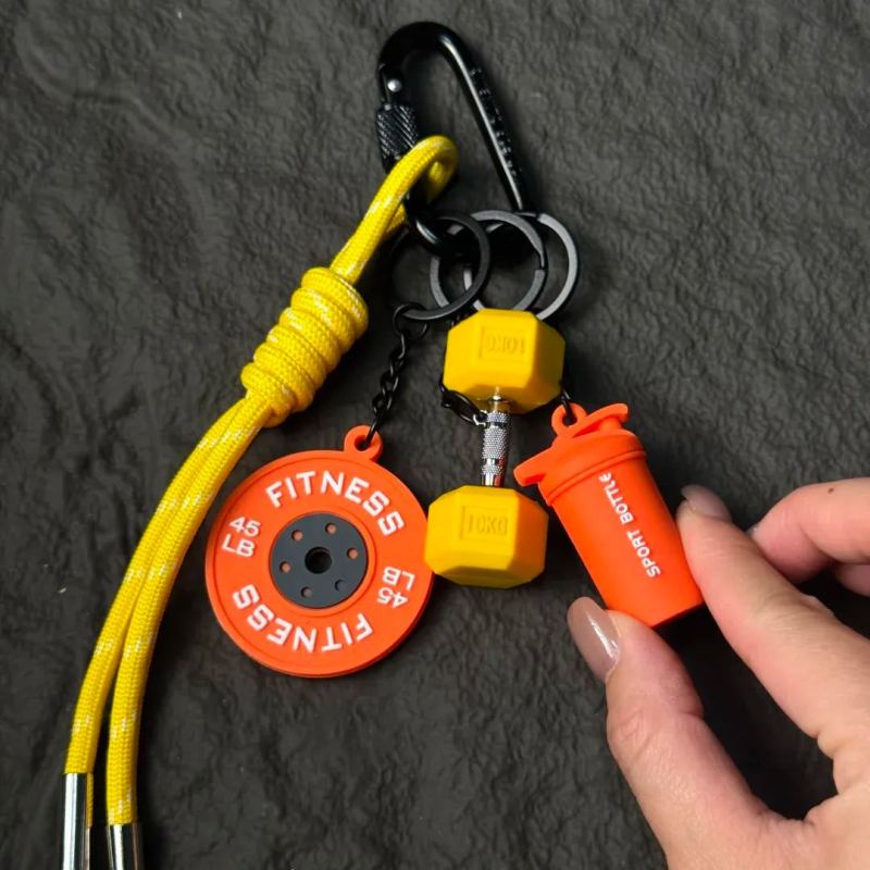 Portachiavi a forma di manubrio elegante – l'accessorio perfetto ispirato alla palestra.Aggiungi un tocco di stile al tuo look quotidiano con questo accattivante portachiavi a forma di manubrio, progettato esclusivamente per gli amanti del fitness e gli appassionati di palestra che vogliono portare la loro passione sempre con sé.Realizzato in gomma resistente di alta qualità (con componenti in metallo di prima scelta per una maggiore durata), questo mini ciondolo a forma di manubrio è leggero ma incredibilmente robusto, progettato per resistere all'usura quotidiana mantenendo un aspetto elegante e sportivo. È completo di un ciondolo a disco a tema fitness abbinato, un ciondolo a forma di mini borraccia sportiva e un robusto cinturino in paracord intrecciato con un moschettone sicuro, perfetto per essere attaccato a chiavi, zaini, borse da palestra o attrezzatura sportiva.