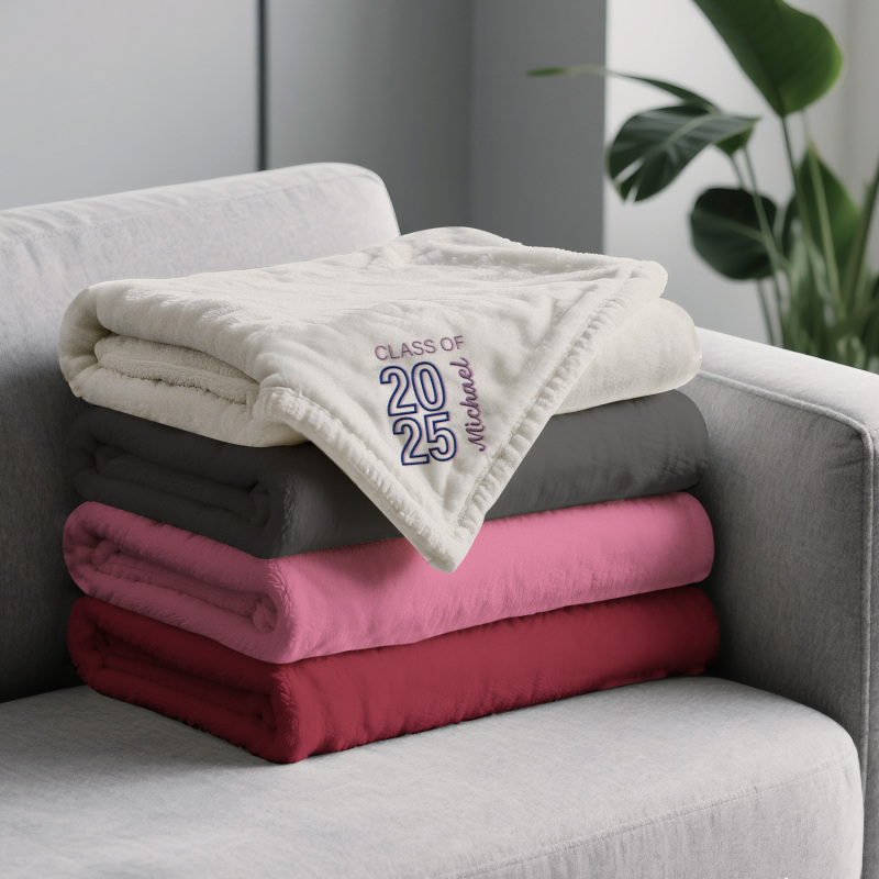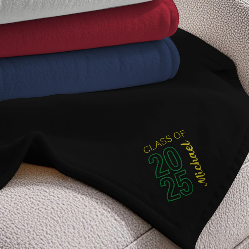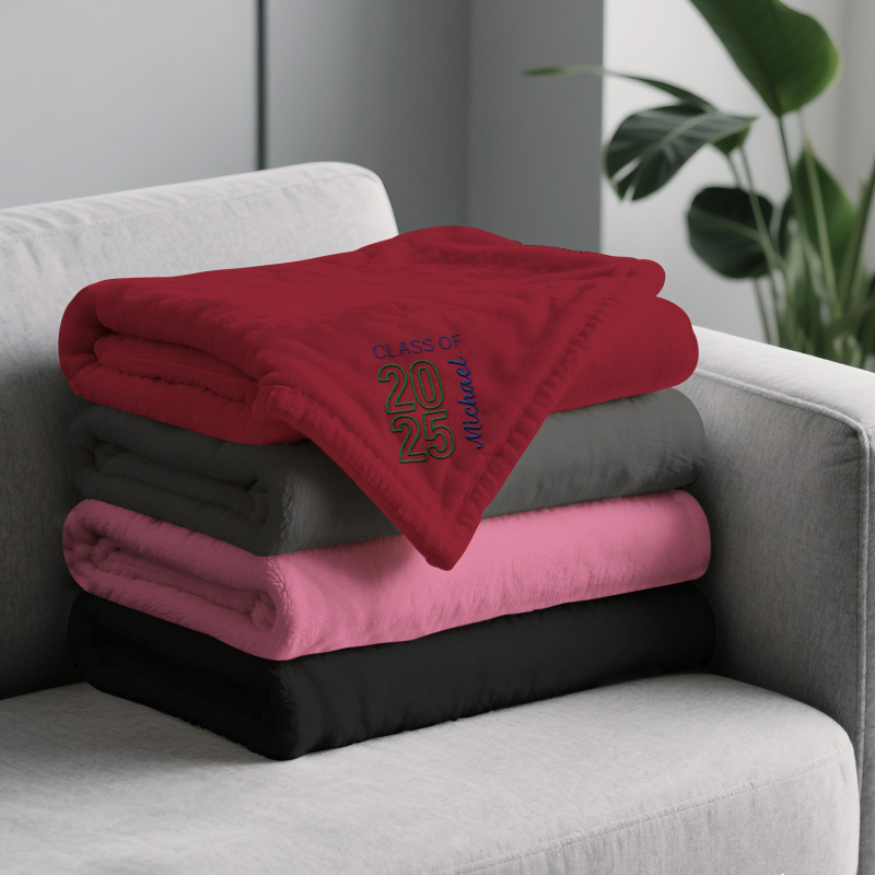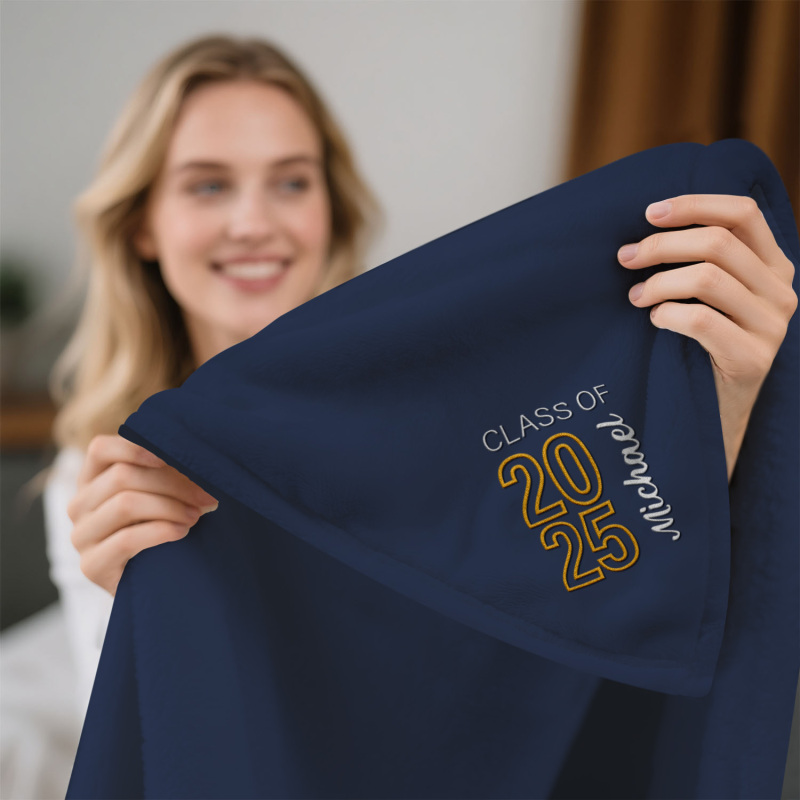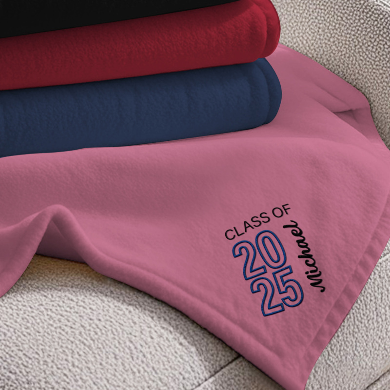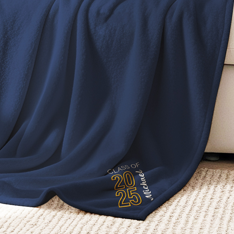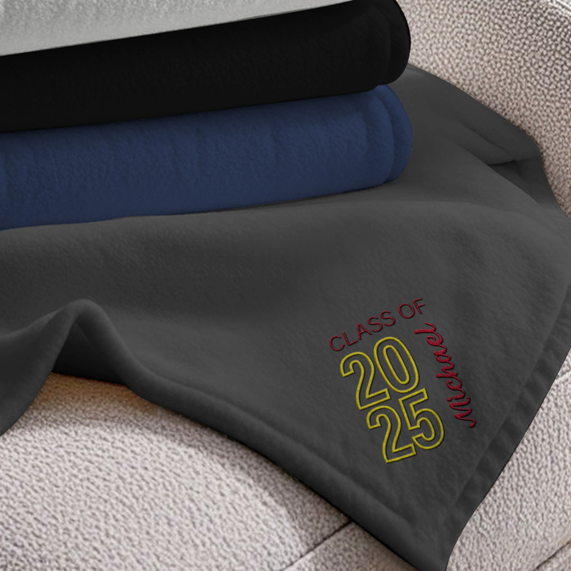 Celebra i tuoi successi con la coperta in pile ricamata 'Graduating Class Of', disponibile in grigio, rosa, nero, beige e blu navy. Scegli tra tre misure: 70*100 cm, 100*120 cm o 120*200 cm: perfetta per celebrare momenti speciali con stile e comfort.
