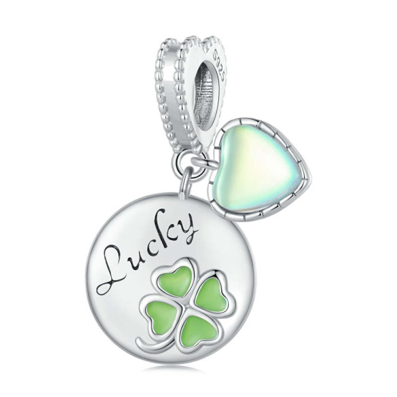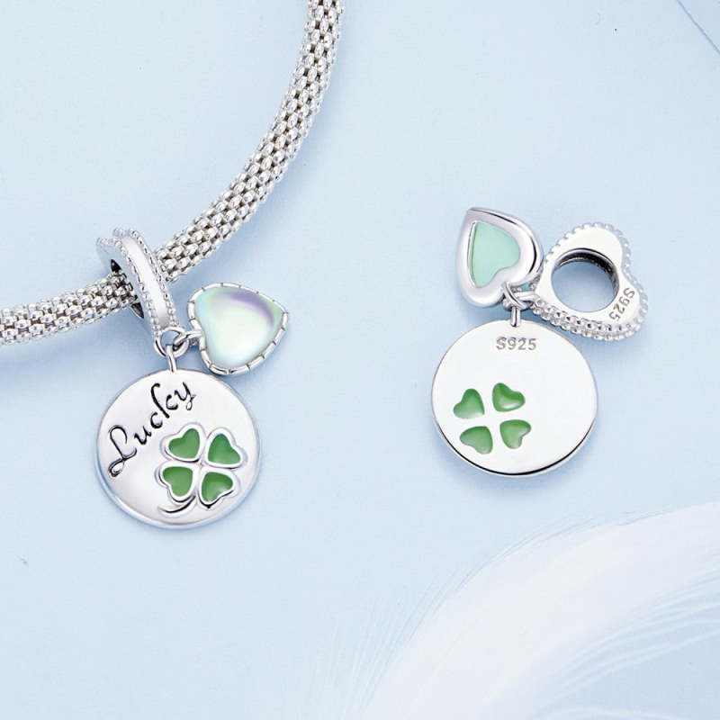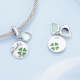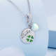 Amuleto colgante de la suerte con forma redonda de trébol verde de cuatro hojas con corazón de cristal en plata