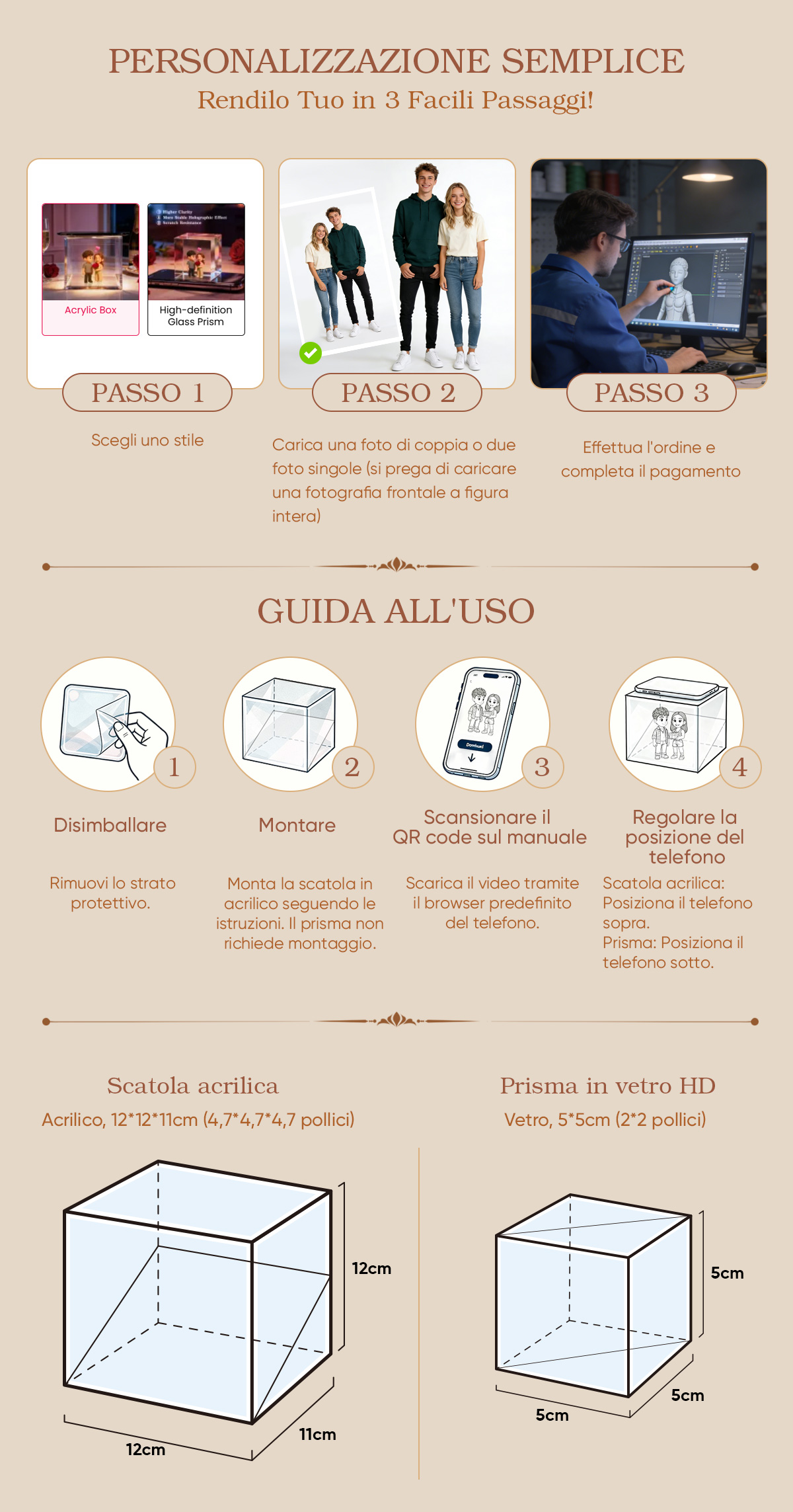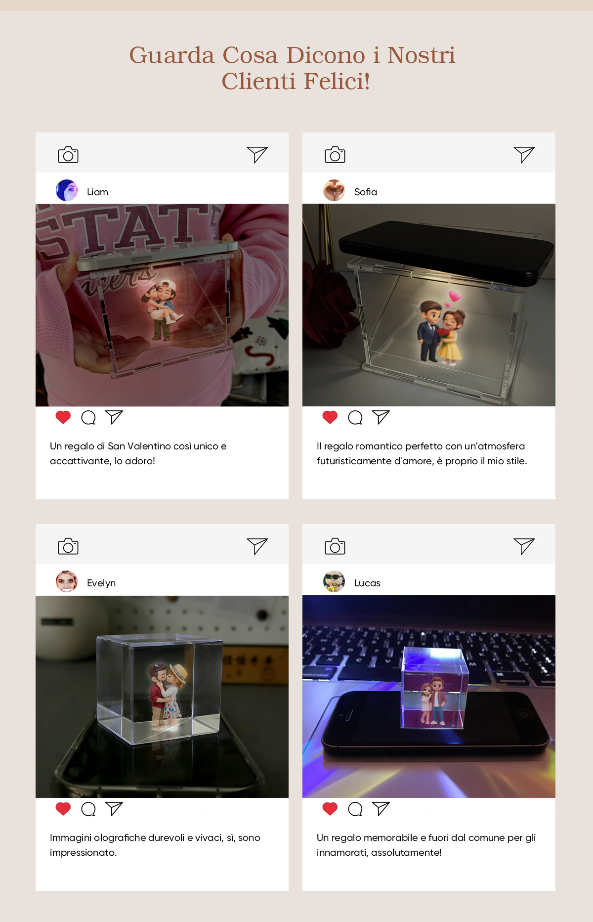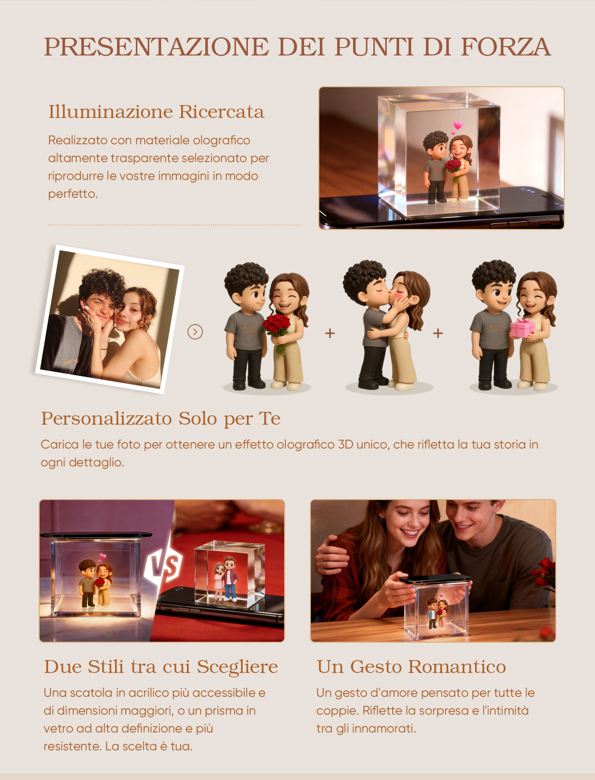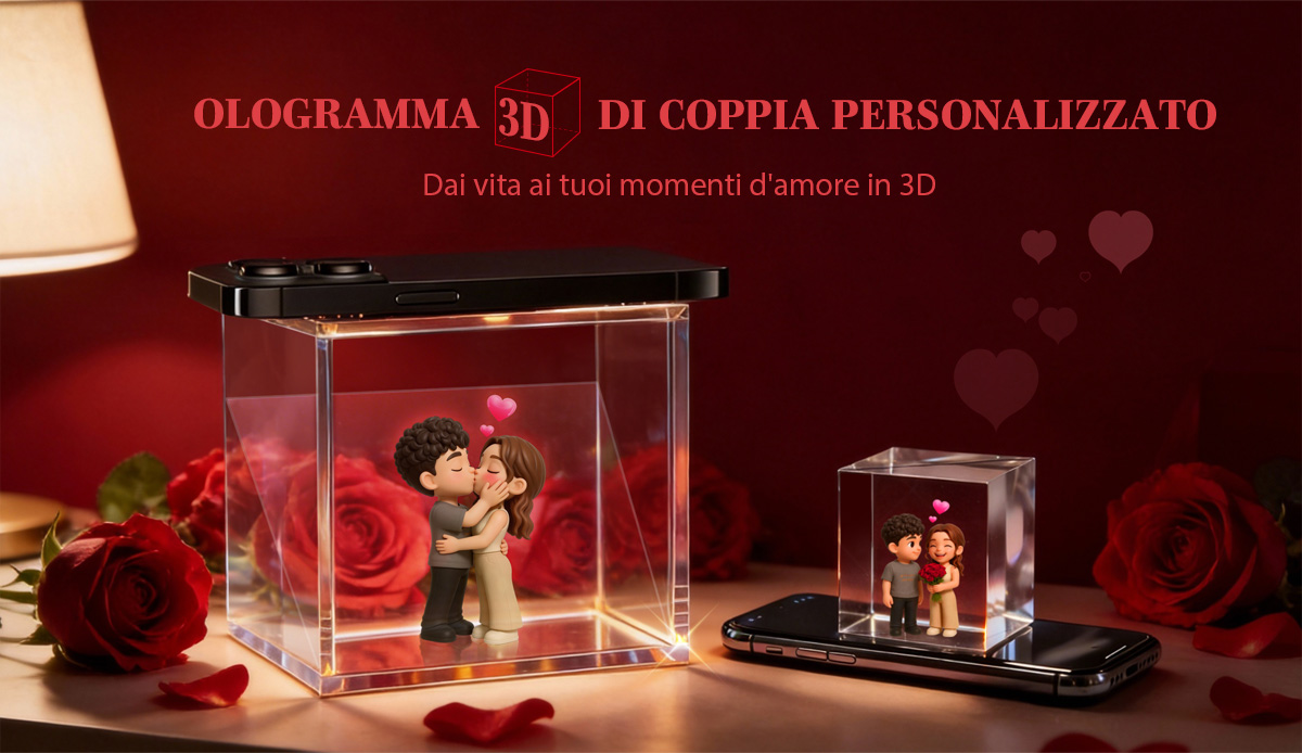Carica le tue foto per ottenere un effetto olografico 3D unico che riflette fedelmente la tua storia in ogni dettaglio.