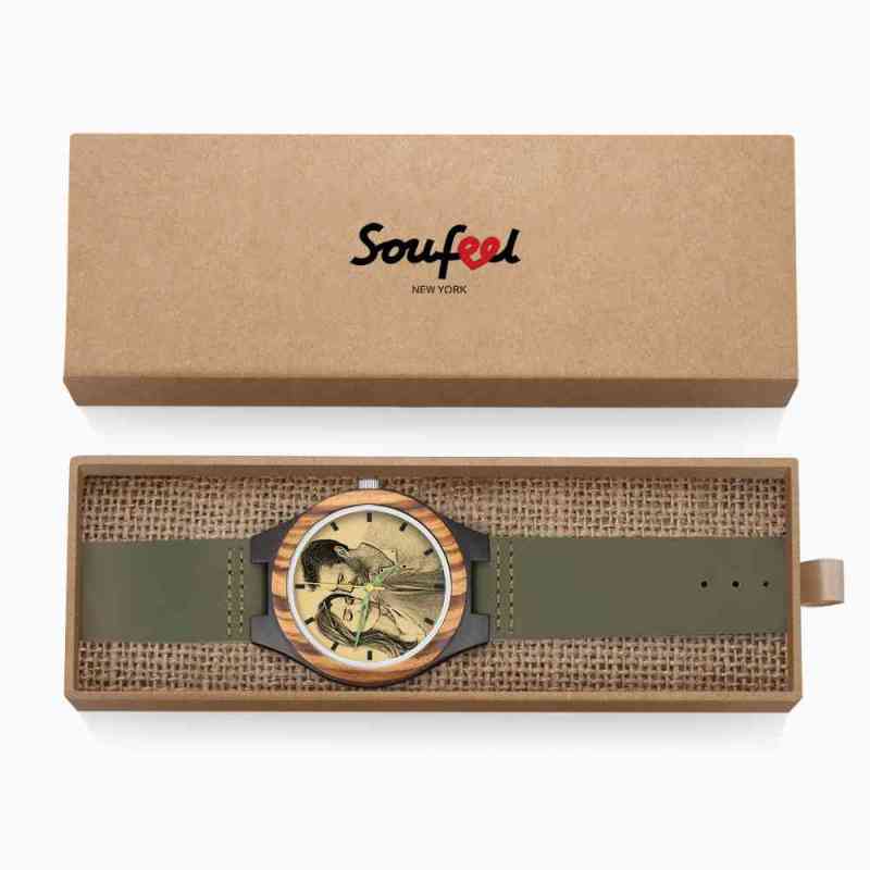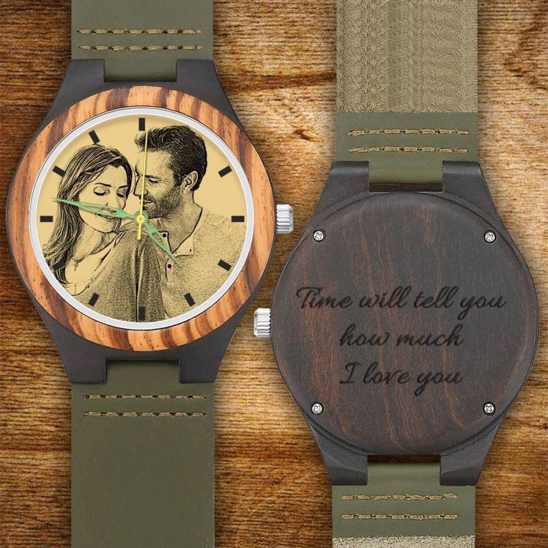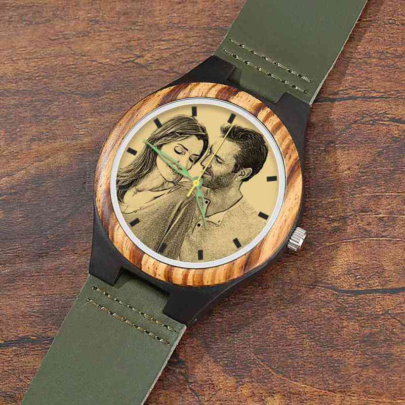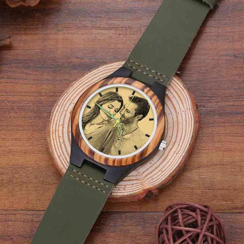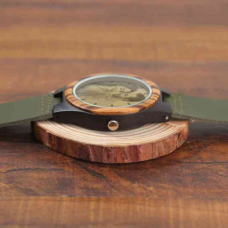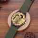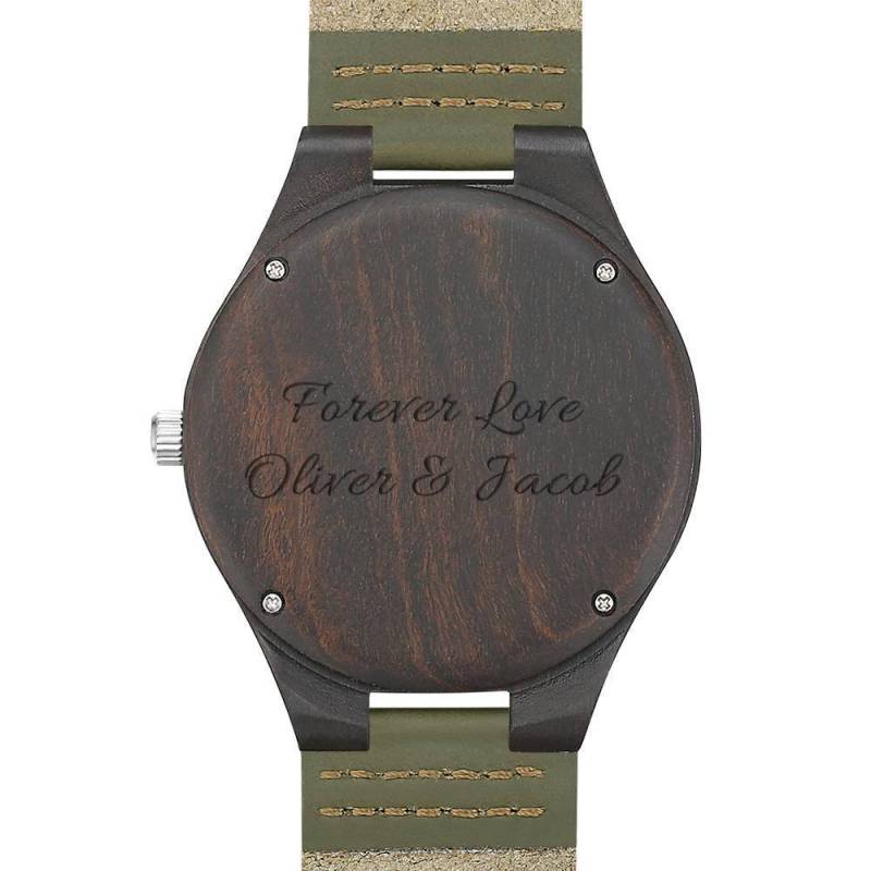 Orologio Da Uomo In Legno Con Incisione Da Uomo Cinturino In Pelle Verde Scuro 45mm