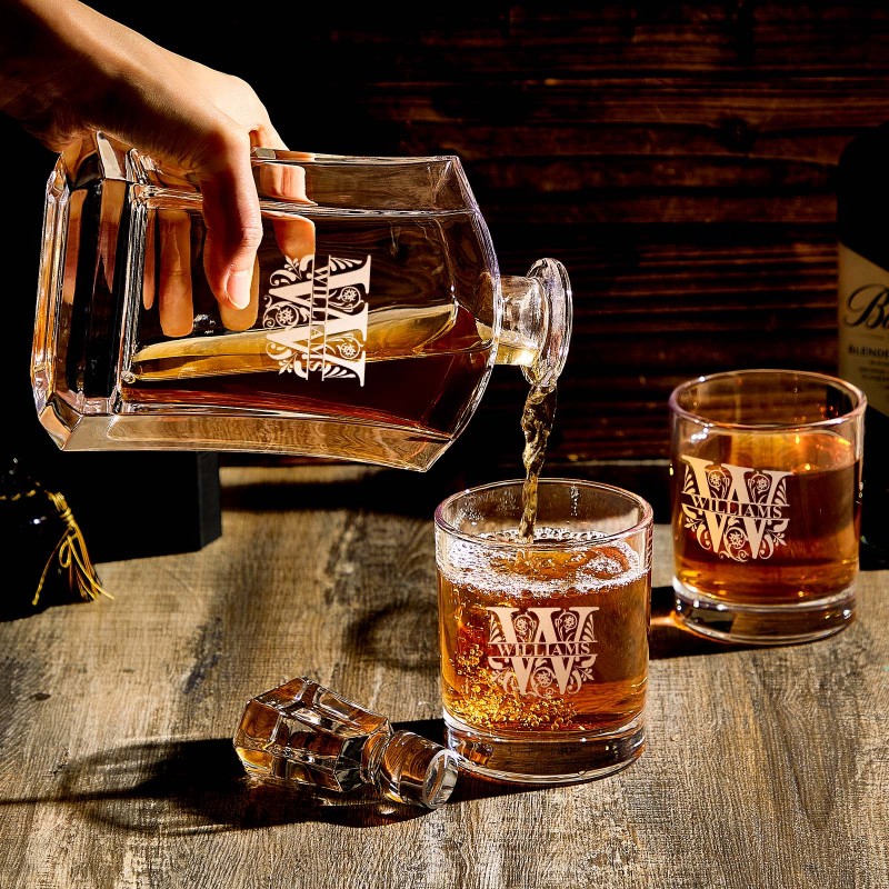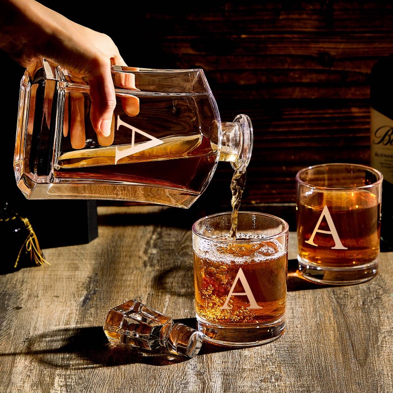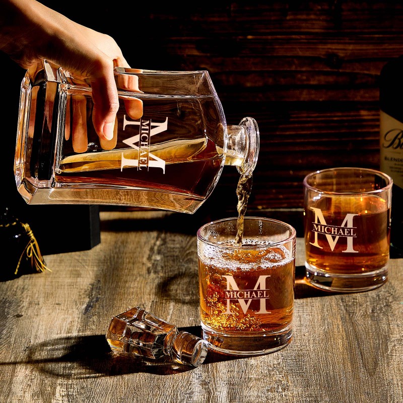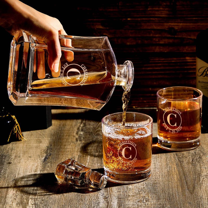 Dai al tuo bar un tocco di eleganza con questo set decanter personalizzato con 2 bicchieri lowball abbinati. Questo bellissimo decanter è realizzato in vetro pesante e con una personalizzazione abbinata al decanter. Cerchi un fantastico regalo per i testimoni dello sposo? Questo set di decanter e bicchieri sarà sicuramente utile per i tuoi migliori amici per anni. Non accontentarti di un regalo ordinario e ordina il tuo decanter e il tuo set di bicchieri con monogramma!