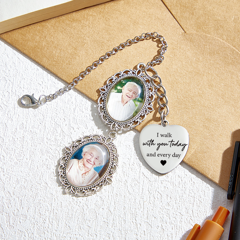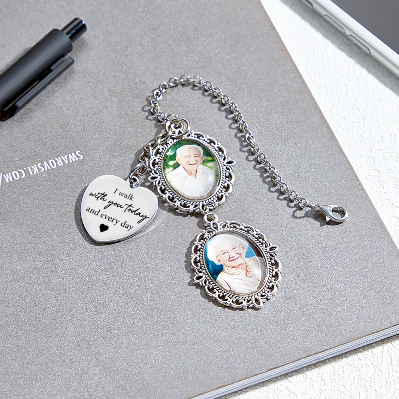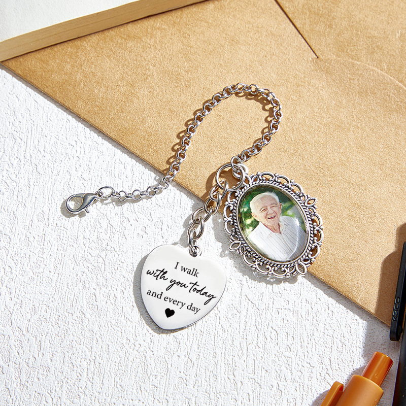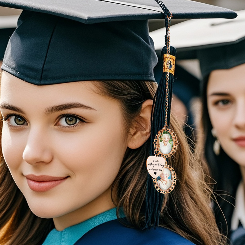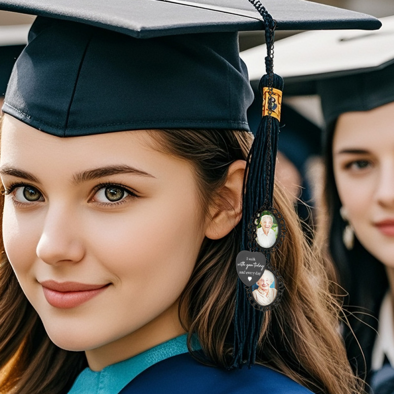 Celebra il ricordo di una persona cara nel tuo giorno speciale con questo ciondolo con foto commemorativa per la laurea: un ricordo sentito che ti accompagnerà sul palco. Questo ciondolo con nappa personalizzato presenta un set di foto personalizzate in un elegante design di ispirazione vintage, completato da un ciondolo a forma di cuore con l'incisione 'Cammino con te oggi e ogni giorno'.