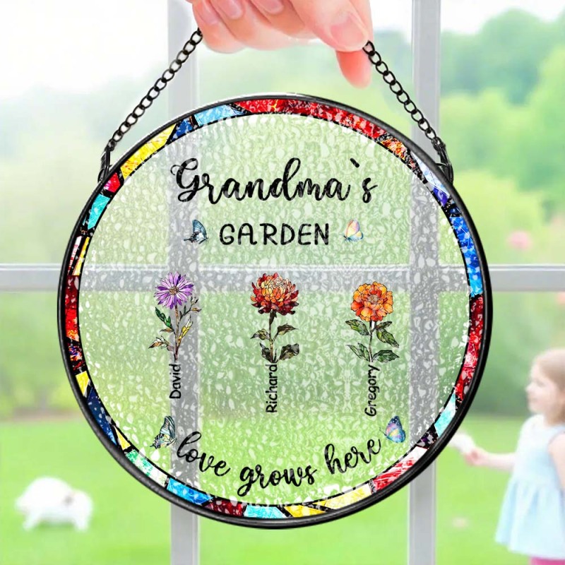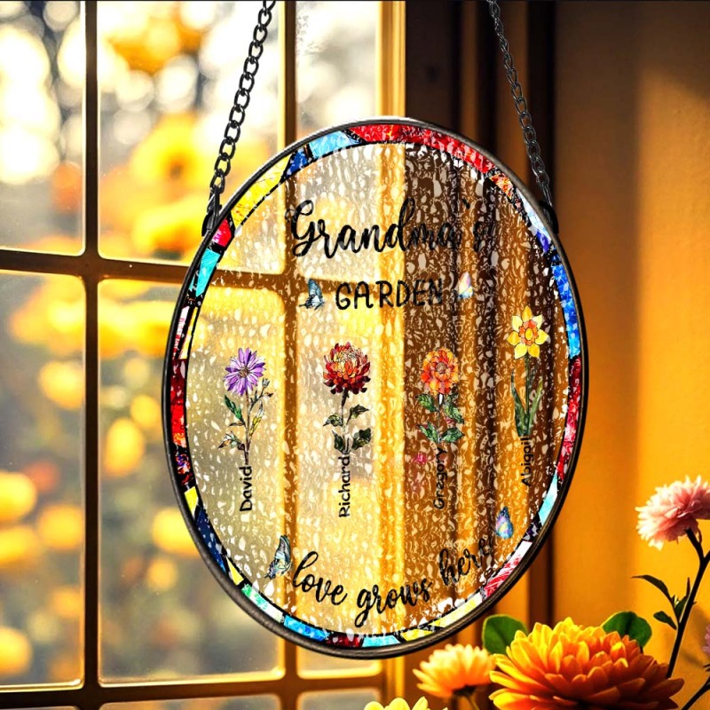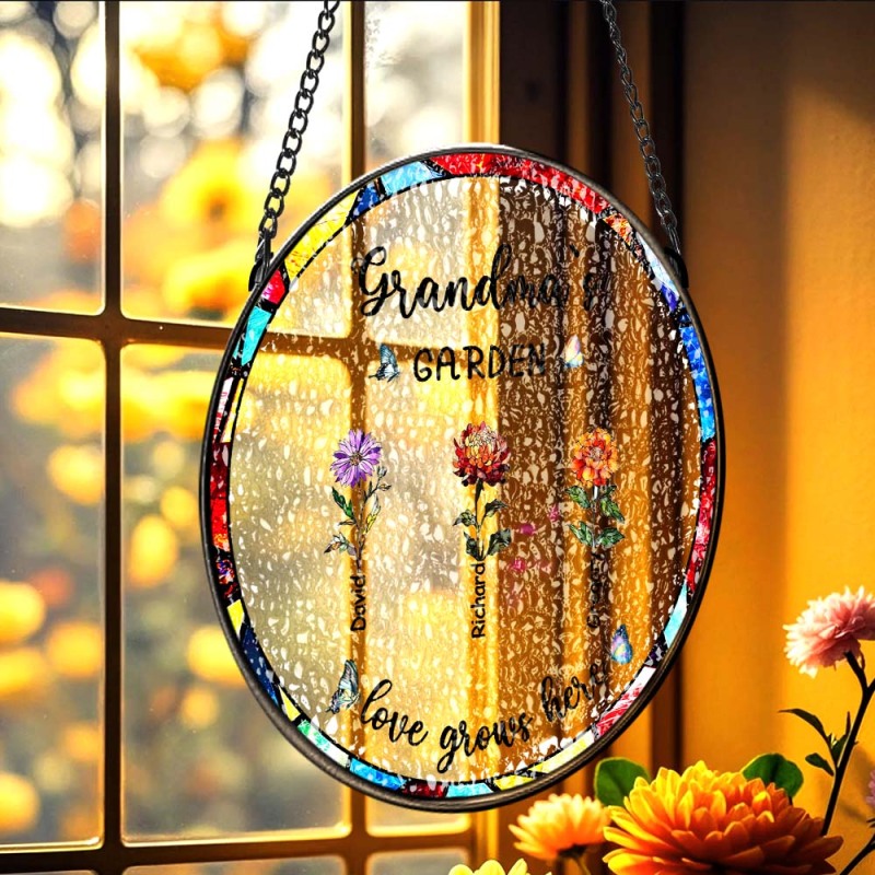 Porta calore e colore in uno spazio prezioso con un acchiappasole in vetro con fiori di compleanno personalizzati: un ricordo personalizzato e baciato dal sole che celebra la famiglia, i compleanni e la bellezza del giardino della nonna.