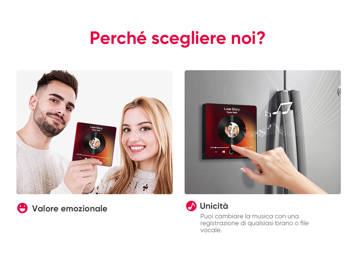 Dai vita alla tua musica preferita con il nostro album magnetico da frigorifero personalizzato! Questo magnete innovativo è molto più di un semplice pezzo decorativo: è un dispositivo funzionale e interattivo che ti consente di riprodurre le tue canzoni preferite direttamente dal tuo frigorifero. Che tu voglia ascoltare una playlist rilassante mentre cucini o goderti la tua musica preferita mentre prendi uno spuntino, questo magnete da frigo rende tutto possibile.