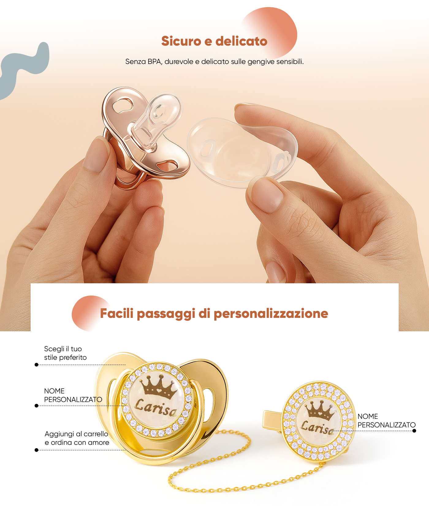 Offri al tuo bambino la combinazione perfetta di sicurezza ed eleganza con il nostro ciuccio personalizzato fatto a mano. Realizzato in silicone liquido alimentare di alta qualità e decorato con cristalli scintillanti, questo ciuccio è più di un semplice oggetto essenziale: è un lussuoso ricordo.