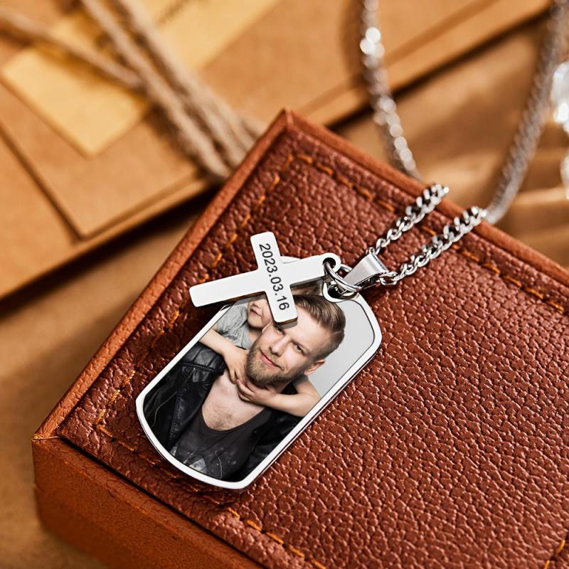 Una collana con incisione personalizzata è un regalo perfetto per la festa del papà che simboleggia l'amore e il legame tra un padre e i suoi figli. Questa collana di famiglia è progettata con un ciondolo a croce che include la data, un testo speciale e una foto, rendendola un gioiello bellissimo e sentimentale che può essere amato per tutta la vita.