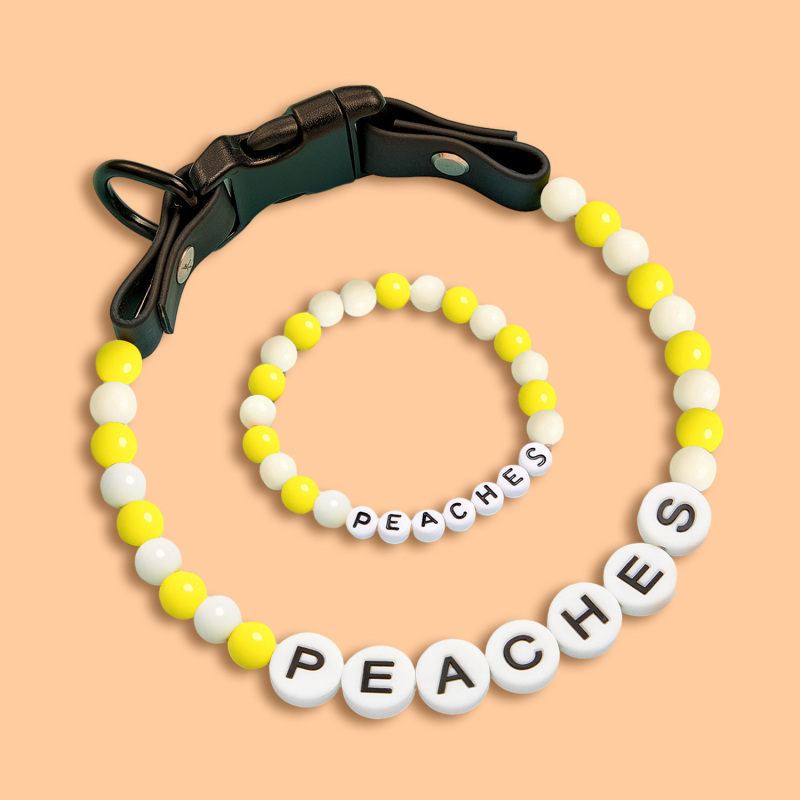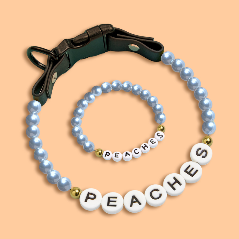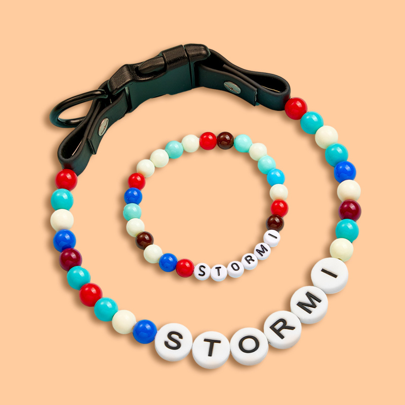 Ogni collare è amorevolmente personalizzato con il nome del tuo animale domestico utilizzando perline divertenti e colorate. E ora, ricevi un braccialetto abbinato, completamente GRATIS! Indossalo per mostrare il tuo amore e il tuo stile insieme.