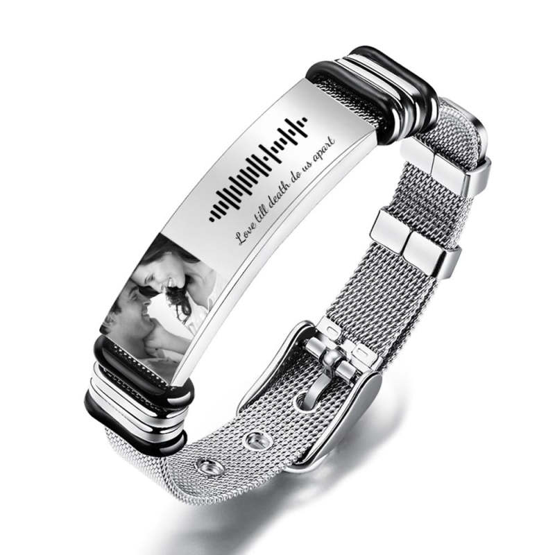 Questo braccialetto unico è il miglior regalo perfetto per lui. Realizzato in acciaio inossidabile, come se il tuo amore per lui potesse durare per sempre. Personalizza il braccialetto con codice musicale, con foto e parole incise, scegli la tua canzone, foto e parole preferite, tutto può essere stampato sul braccialetto e puoi generare un codice Music univoco. Puoi scansionare il codice sull'app Music, dopo aver scansionato il codice, la tua canzone inizierà immediatamente a suonare. È un regalo perfetto per l'anniversario di coppia, per San Valentino, per il giorno del matrimonio e per varie occasioni.