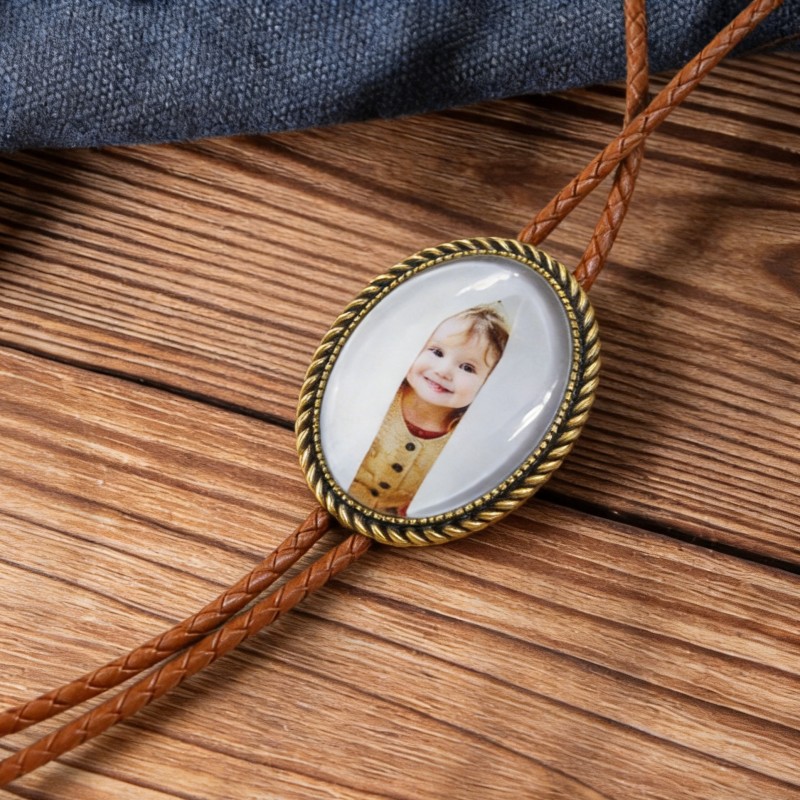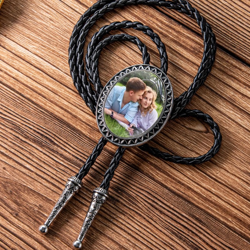 Trasforma un ricordo speciale in un accessorio senza tempo. Questa Cravatta di cuoio personalizzata con foto presenta la foto che hai scelto, elegantemente incastonata in un classico design da cravatta di cuoio con un cordino in vera pelle. Unendo lo stile tradizionale western alla narrazione personale, è più di una cravatta: è un ricordo da indossare.