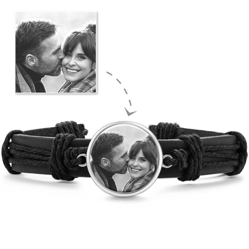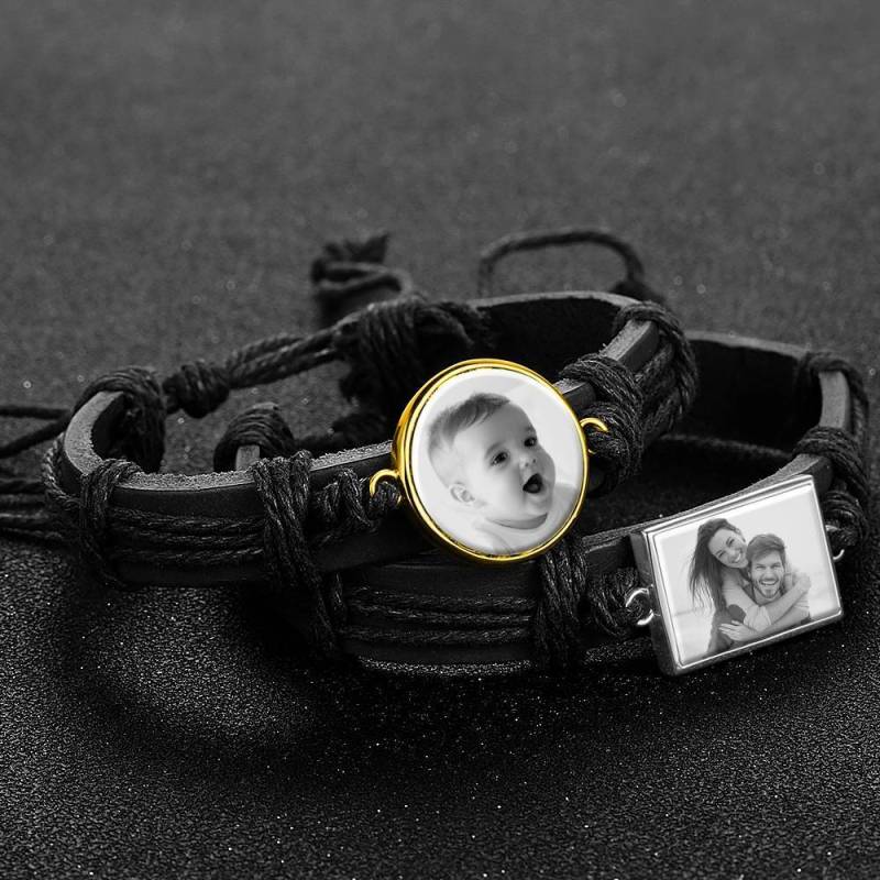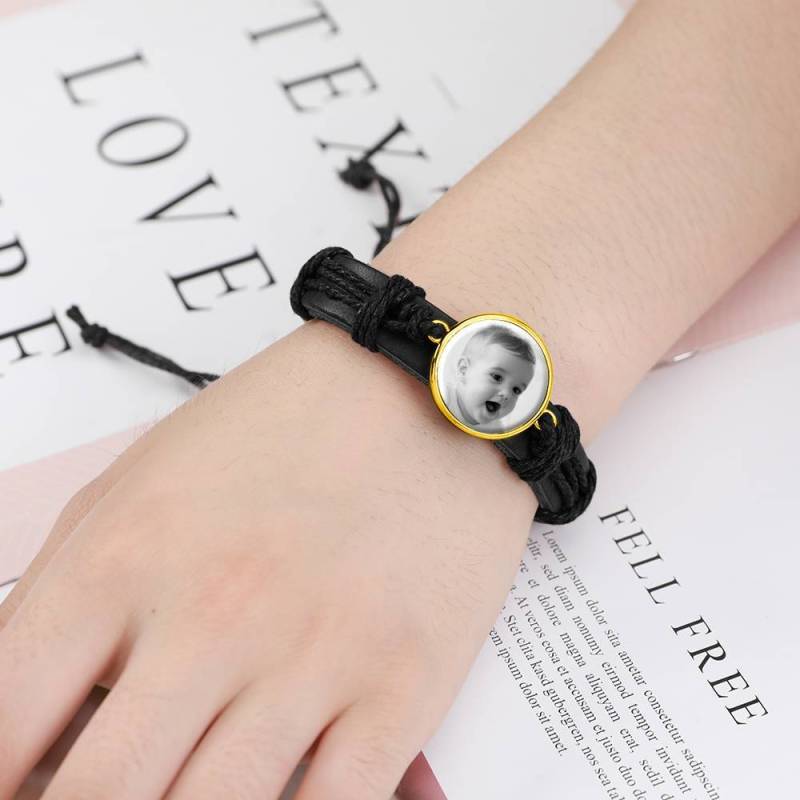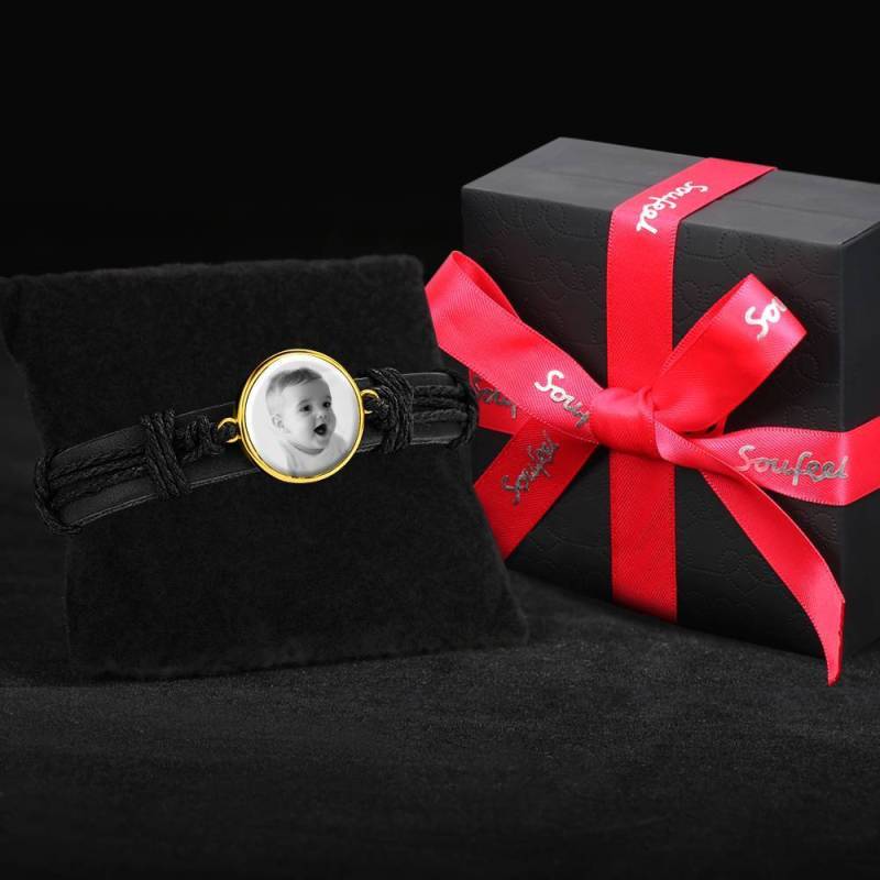 Ci sono alcune immagini o persone che ti fanno sentire caldo e diffuso dentro? In tal caso, i nostri braccialetti fotografici incisi sono un must per te. Soufeel offre una vasta gamma di braccialetti con ciondoli per foto che puoi personalizzare con le foto che scegli. Fai scorrere le immagini dei tuoi figli, del tuo partner, dei tuoi animali domestici o di qualsiasi altra cosa tu voglia vedere. Ci sono diversi bracciali tra cui scegliere, come bracciali in pelle e bracciali in metallo semplice. Alla ricerca di un regalo perfetto per una persona cara? Quindi questo bracciale in pelle è la risposta. Prendi uno e guarda il tuo cuore sciogliersi! Bracciale con foto, regalo di souvenir in pelle nera con forma rotonda placcato in oro 14K - fotocopiato.