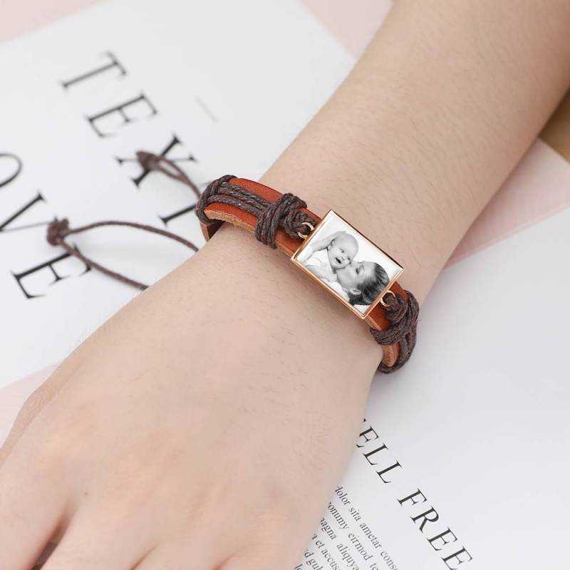 Ci sono alcune immagini o persone che ti fanno sentire caldo e diffuso dentro? In tal caso, i nostri braccialetti fotografici incisi sono un must per te. Soufeel offre una vasta gamma di braccialetti con ciondoli per foto che puoi personalizzare con le foto che scegli. Fai scorrere le immagini dei tuoi figli, del tuo partner, dei tuoi animali domestici o di qualsiasi altra cosa tu voglia vedere. Ci sono diversi bracciali tra cui scegliere, come bracciali in pelle e bracciali in metallo semplice. Alla ricerca di un regalo perfetto per una persona cara? Quindi questo bracciale in pelle è la risposta. Prendi uno e guarda il tuo cuore sciogliersi! Bracciale con foto, unico regalo in pelle marrone forma quadrata placcato in oro rosa - fotocopiato.