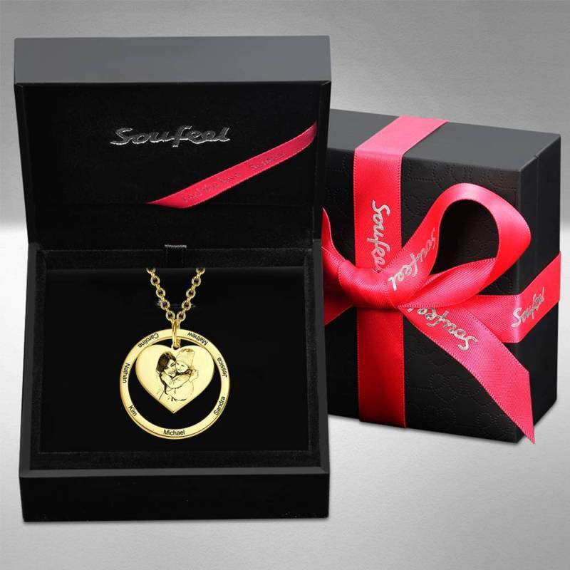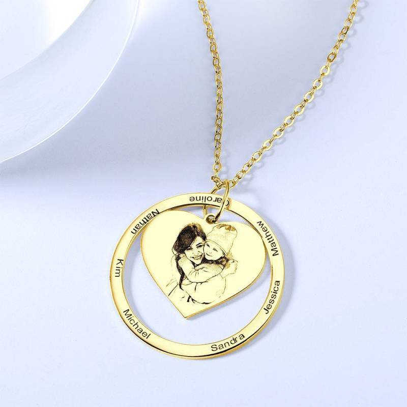L'incisione fotografica è la nuova tendenza più amata, in quanto ti consente di ricordare la tua foto preferita in un gioiello che puoi indossare ogni giorno. Questa collana con foto incisa è lo sfondo perfetto per la tua foto preferita. Aggiungi un ulteriore livello di personalizzazione posizionando un'incisione sul retro di questo ciondolo con foto incisa. Il regalo perfetto, premuroso, divertente e unico per ogni occasione! Soufeel ha un sacco di opzioni di gioielli personalizzati a prezzi ragionevoli e sono regali eccellenti per tutti i tipi di occasioni come compleanni, vacanze, anniversari Collana incisa con foto a forma di cuore in pendente rotondo, collana di famiglia placcata in oro 14K - Oro