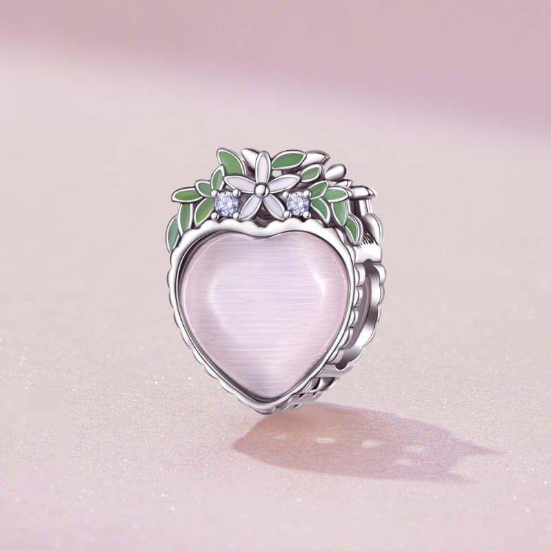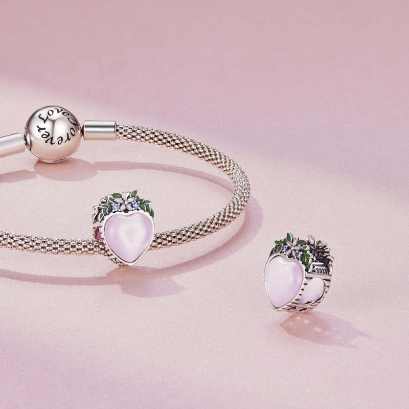 Dije Corazón Rosa Hoja Verde Plata