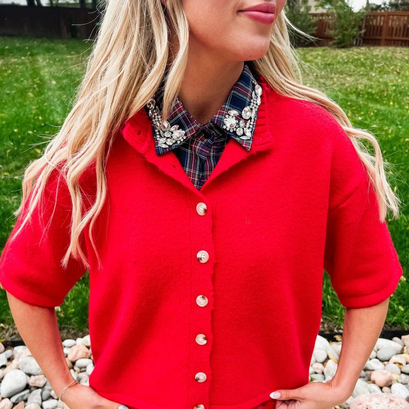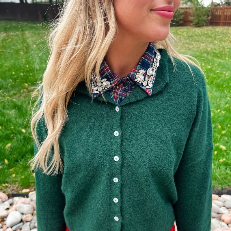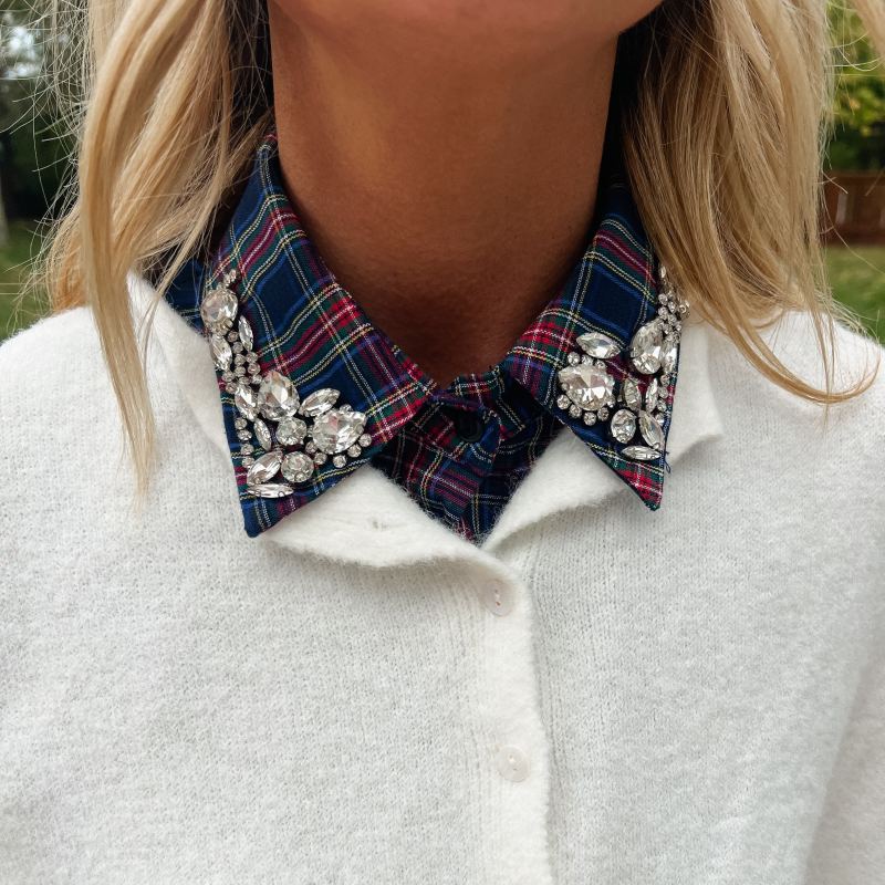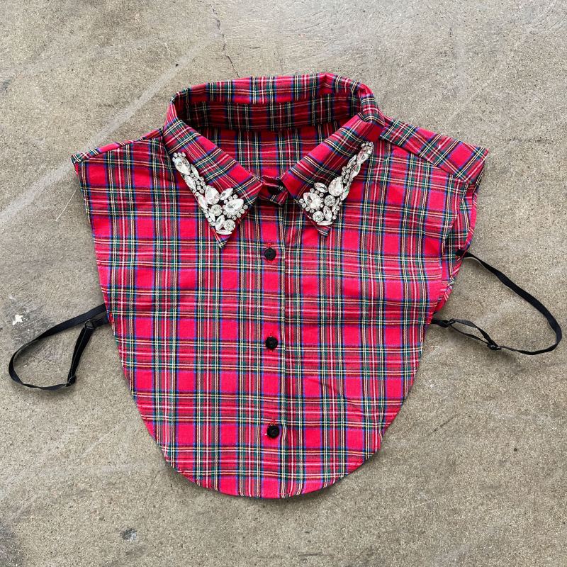Aggiungi un tocco scintillante al tuo outfit natalizio con questo colletto scozzese rosso natalizio con strass. Il suo motivo scozzese rosso natalizio, combinato con strass scintillanti, dona un tocco giocoso e unico, rendendo qualsiasi look immediatamente più gioioso e luminoso per la stagione. Perfetto per diffondere la gioia delle feste con stile!